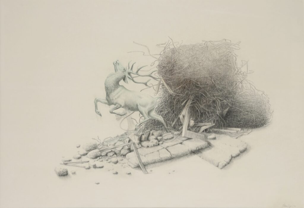 Sayın’ın Demir Çağı eseri, sanatçının Turgut Uyar’dan ilhamla kendi seçkisine koyduğu “Geyikli Gece” isminin vücut bulmuş hâli gibi. İnşaat kalıntılarının arasından fırlayan ve görkemli bir şekilde şaha kalkan bu geyik şehrin döküntülerinin, kentsel dönüşümün, metalin, betonun insan olmayanların ekosistemlerine ve bedenlerine ne yaptığının bir ifadesi gibi.
