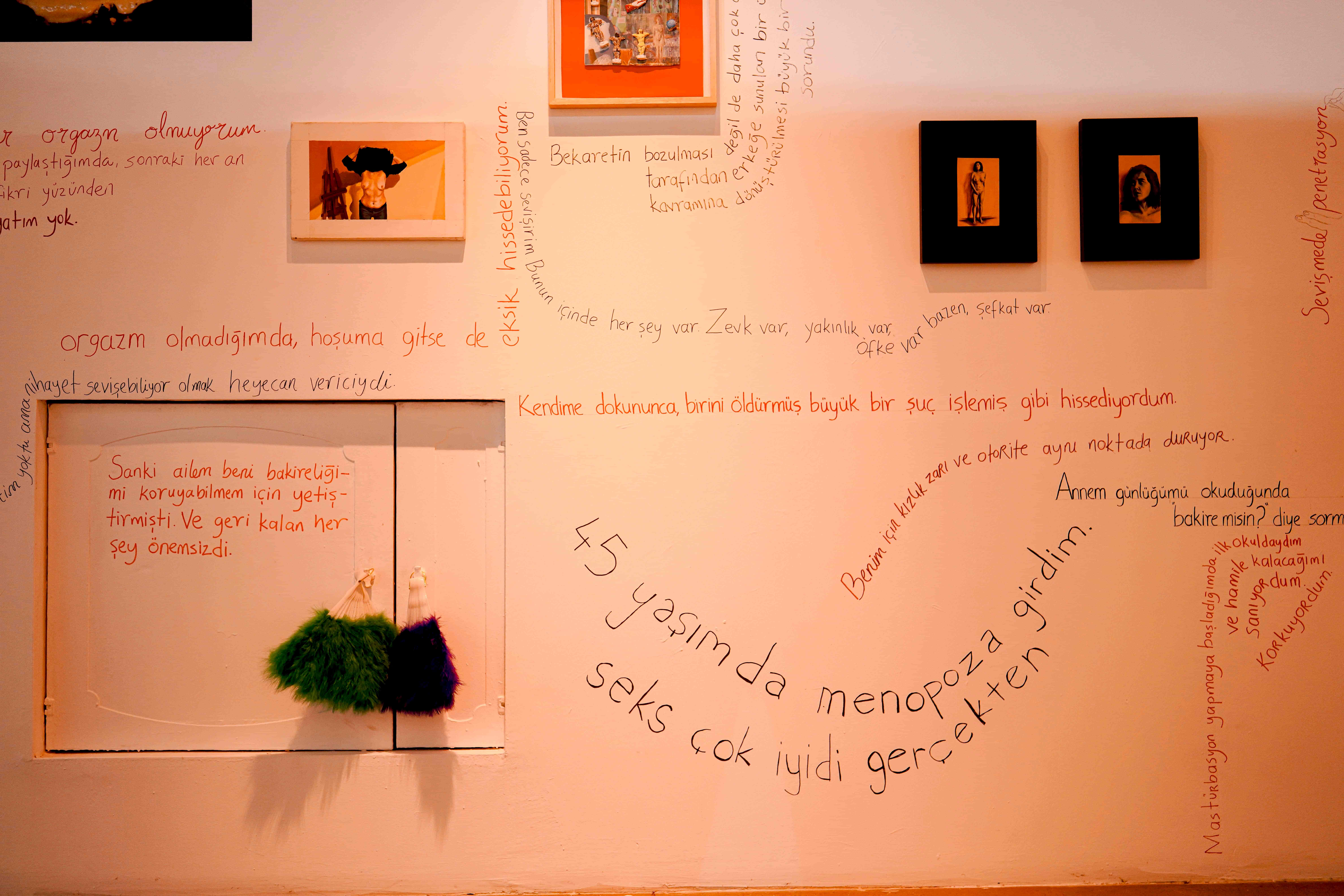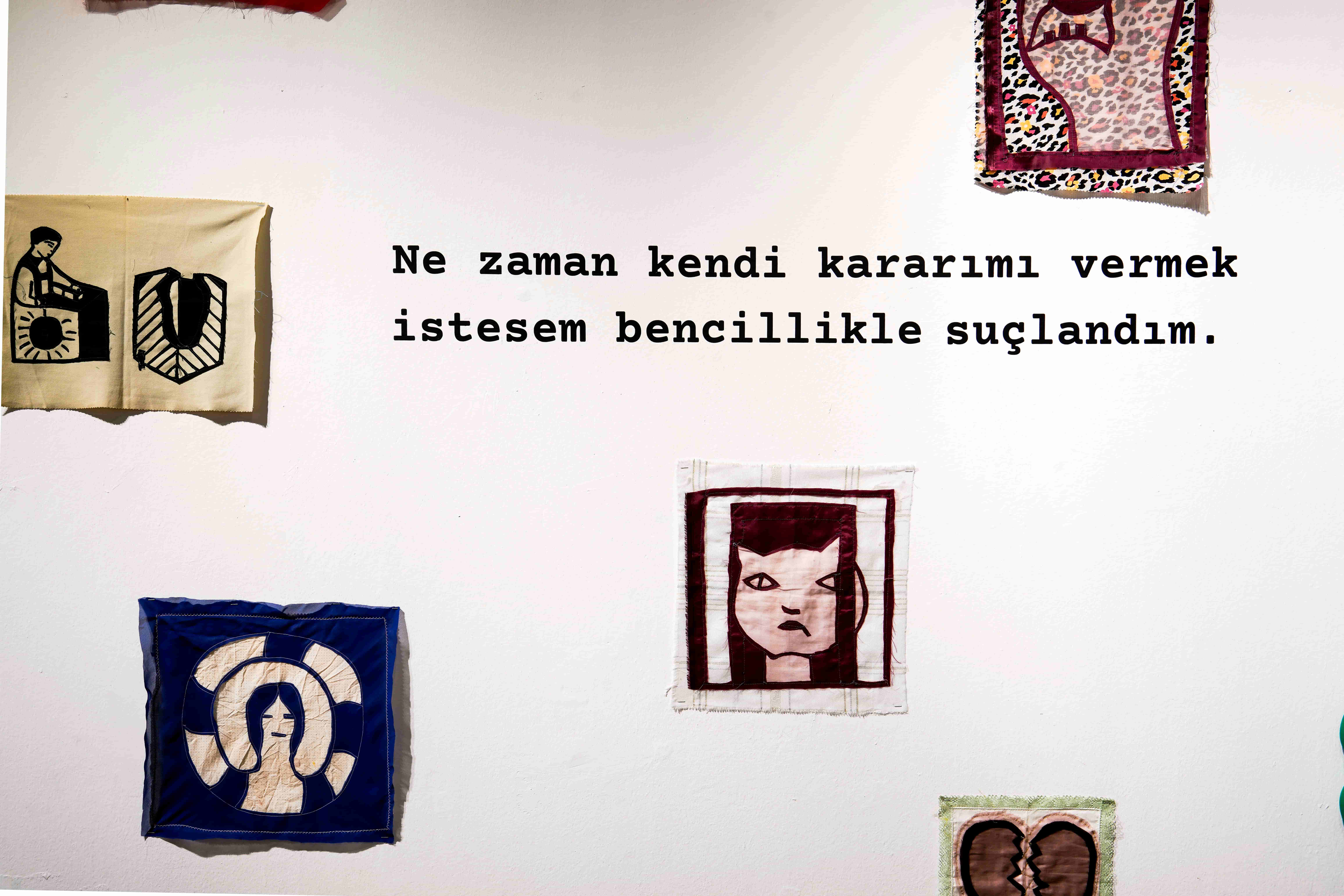 Sergi sırasında aldığımız geri bildirimler de dönüştürücüydü. Bir ziyaretçinin, “Bu sergi, kız çocukluğumdaki duygularımı yeniden hatırlattı; sanki o yaraları sarma fırsatı buldum.” demesi, sanatın ve kolektif hafızanın iyileştirici gücünü hissettirdi. Kitapta kadınların cesurca paylaştığı cinsellik ve bedenle ilgili deneyimler de toplumsal tabuların yıkılmasında ve kadınların bedenleriyle barışmasında paylaşımın önemini vurguladı. Bu hikâyeler, imposter sendromunun yalnızca bireysel değil, toplumsal cinsiyet rolleriyle şekillendiğini anlamamı sağladı. Sergiyi gezen kadınlar, duvarlarda yazan cümlelerle fotoğraf çektirdi. Kimisi ikinci gelişinde annesini de getirip, deneyimini annesiyle paylaştı ve “bazen içimden annem çıkıyor” yazısı ile poz verdi. Kimi gülerek, kimisi isyan duyarak, kimisi de hüzünlenerek sergiyi gezdi. Bir genç kadın, yaşadığı tacizi ilk kez bizim sorularımız vesilesiyle dillendirmeyi başardığını söylerken, bir diğeri yaşadığının aslında bir cinsel suistimal olduğunu soruları cevaplarken keşfettiğini söyledi. Bunlar benim gözlerimi doldursa da, kadınların o güçlenme anlarına tanıklık etmek beni mutlu etti.