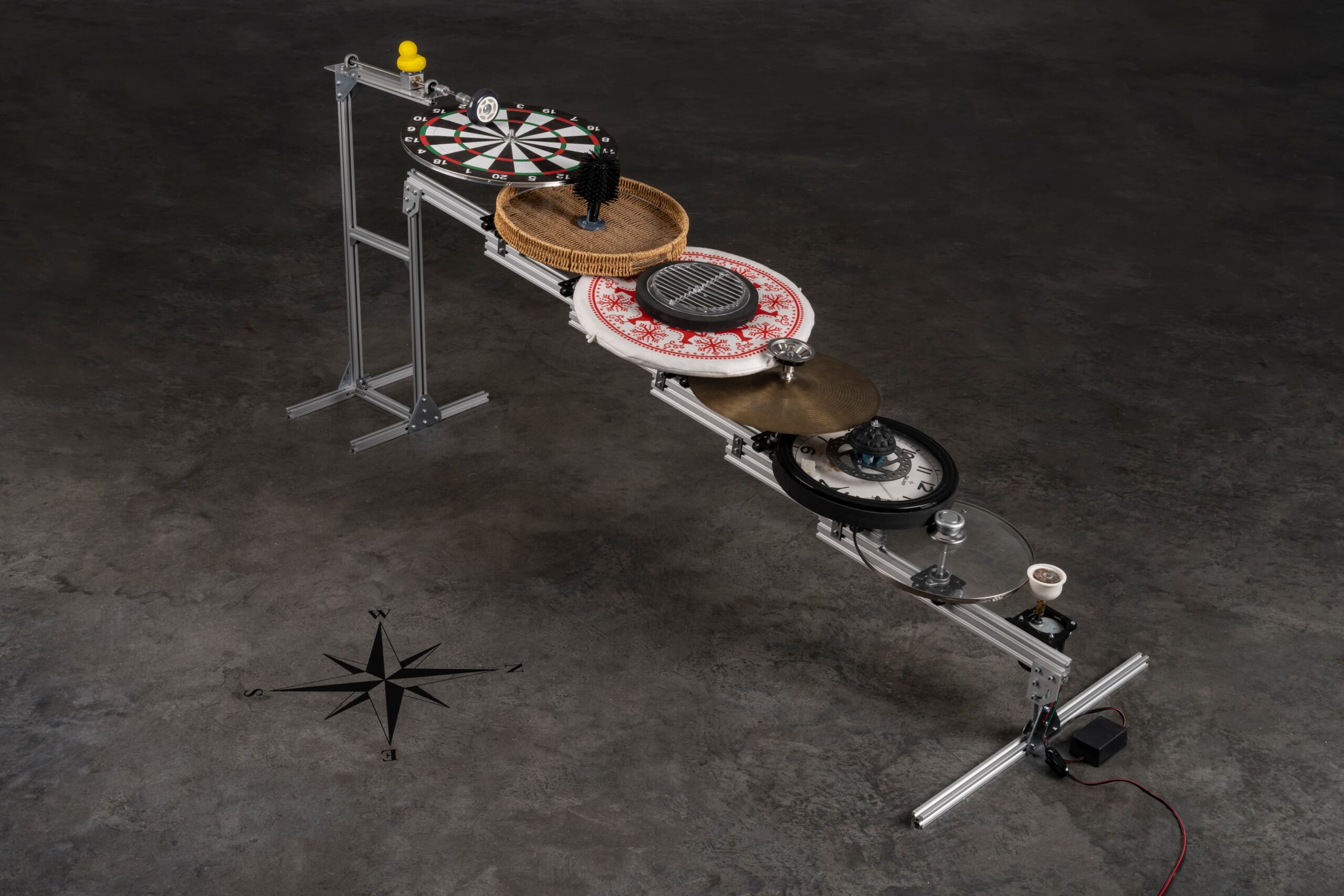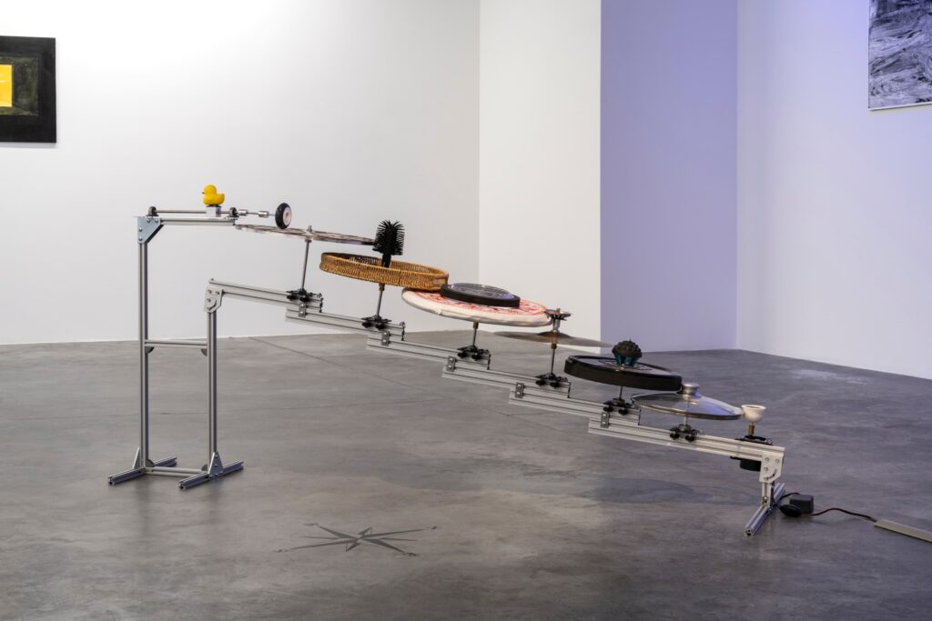 Ali Miharbi’nin Kıta Kayması adlı yerleştirmesi, insan ölçeğinde kavranması neredeyse imkânsız olan jeolojik hızları gündelik nesneler aracılığıyla görünür kılıyor. Disklerin birbirine devrettiği yavaş hareket, İstanbul’un yılda 2,6 cm’lik yer değiştirmesini absürt bir inatla tersine çevirmeye çalışıyor. Bu jest bizlere hem bilimsel ölçümün hem de insan egemenliğinin sınırlarını anımsatıyor.