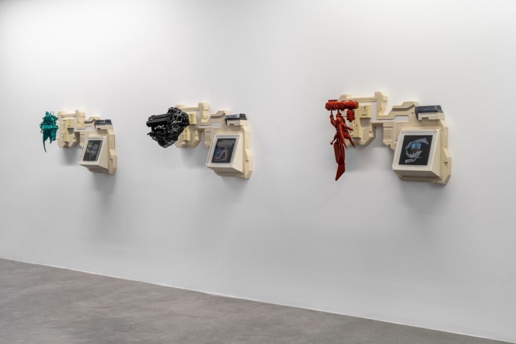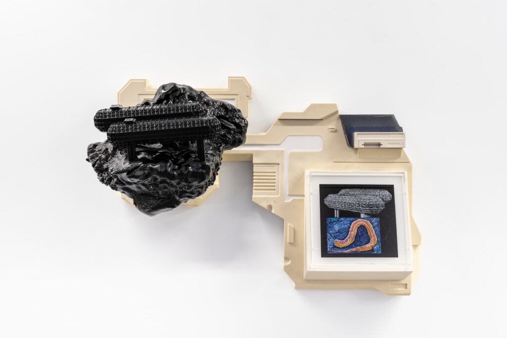 Emre Hüner’in komPoZit NüVe heykelleriyse sergideki en spekülatif hatlardan birini oluşturuyor. İnternette birbirine rastlantısal biçimde çarpan iki görüntünün hibrit forma dönüşmesi, yapay zekânın öngörülemez ilişkilendirme kapasitesiyle birleşerek yeni bir insan-sonrası ikonografisi sunuyor. Bu heykeller birer gelecek fosili gibi hem geçmişin buluntu estetiğini taşıyor hem de geleceğin olanaklı canlı/makine türlerine göz kırpıyor.