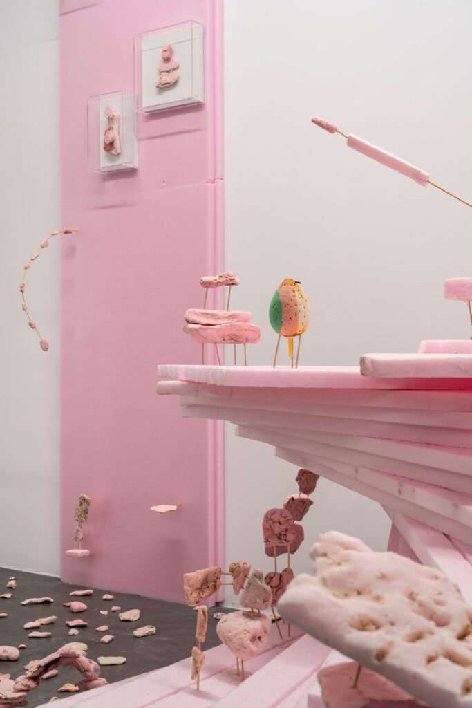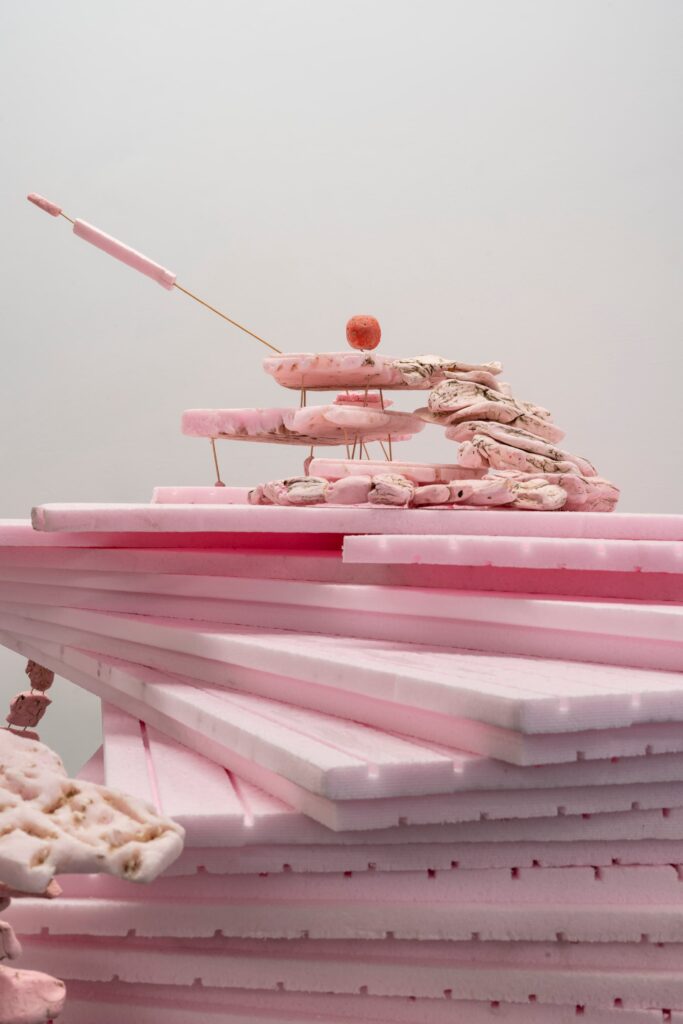 Bu manzarayı Sibel Horada’nın Pembe Şehir’i başka bir uçtan tamamlıyor. Straforun göç yollarını, şiddet izlerini ve denizin üzerinde geçirdiği zamanın maddi izleğini takip eden çalışma, atığın hem ekolojik hem politik hem de duyusal bir hikâye taşıdığını hatırlatıyor. Horada’nın “göçmen nesneleri”, insan merkezli ekolojilerin dışına düşen failliği de görünür kılıyor.