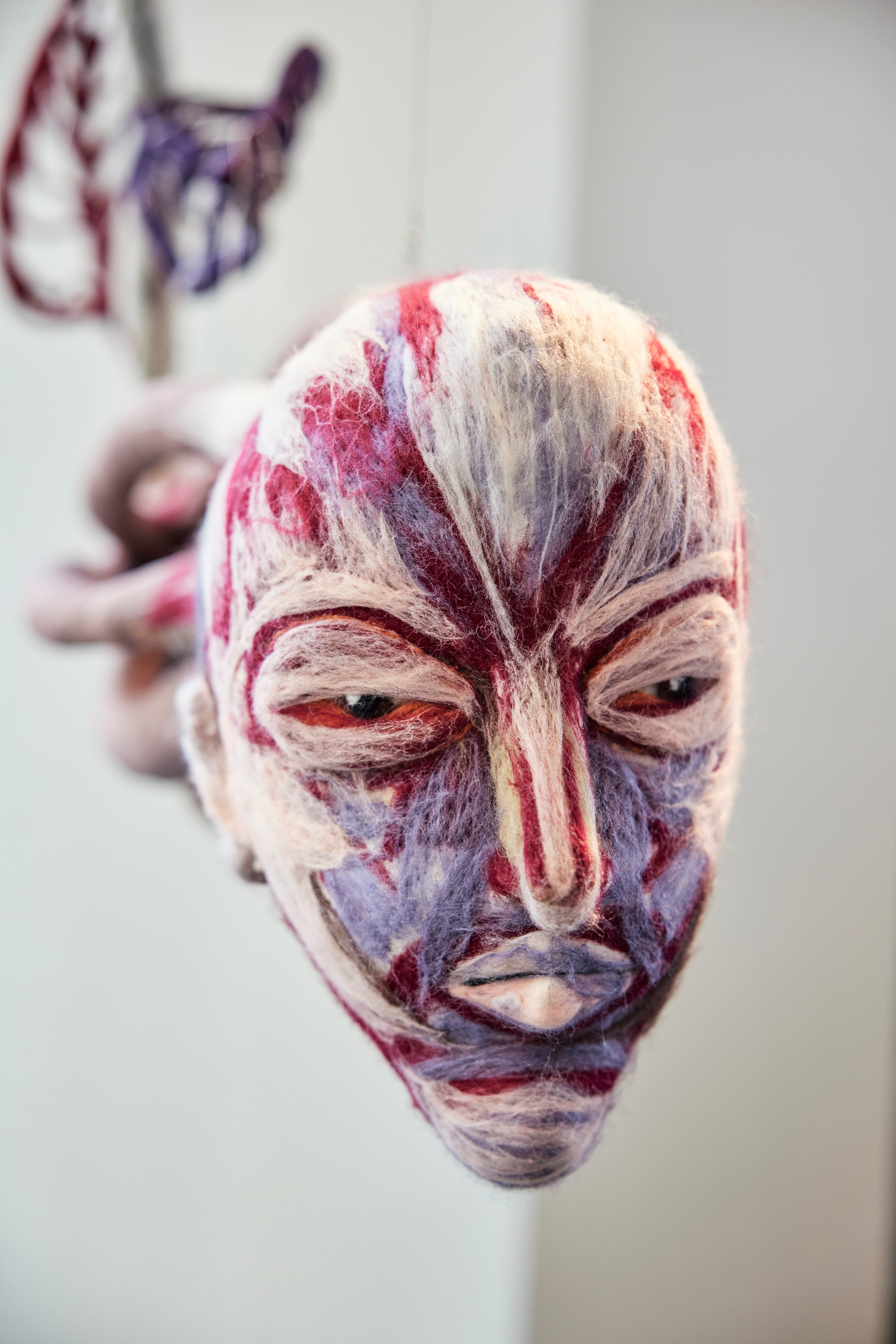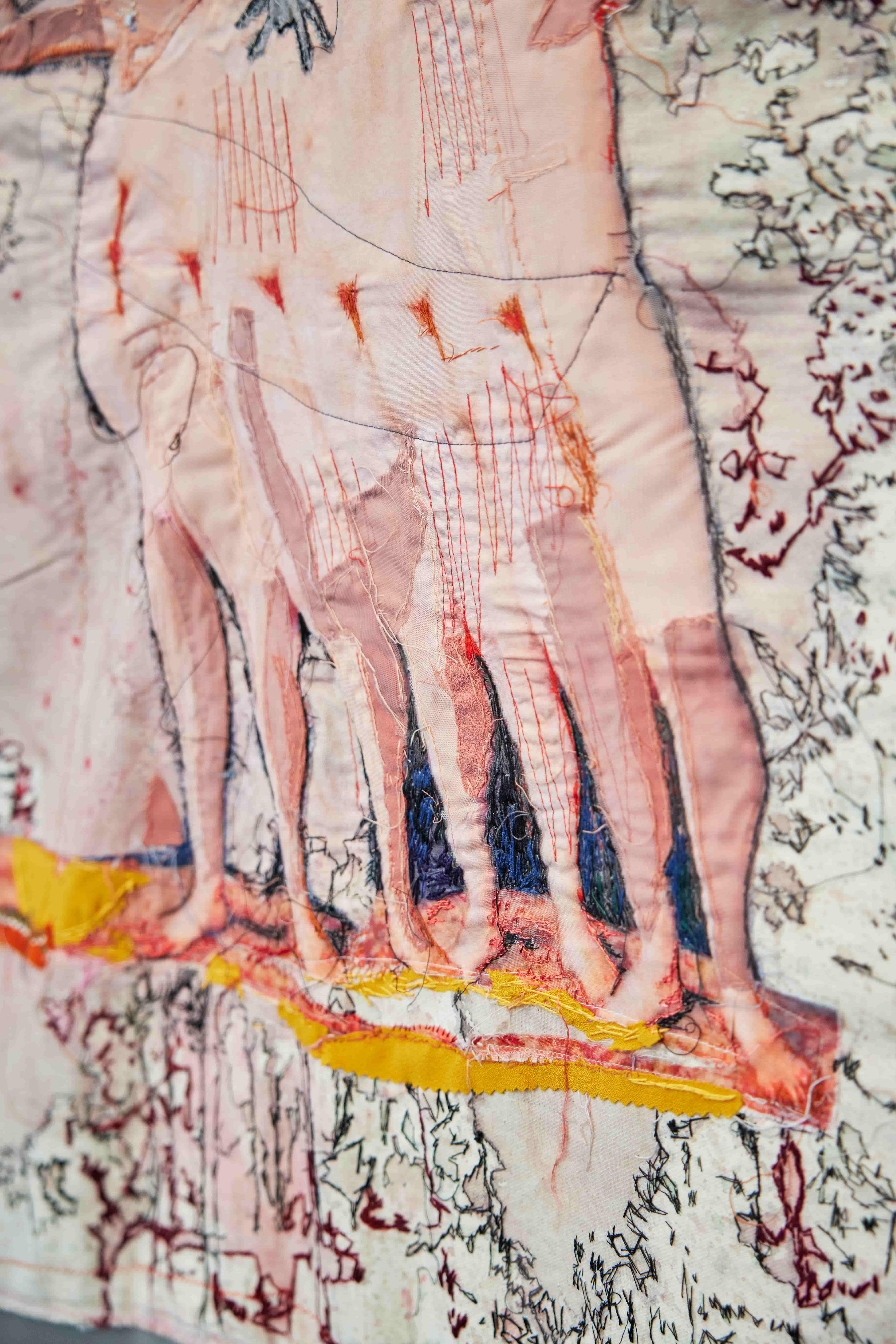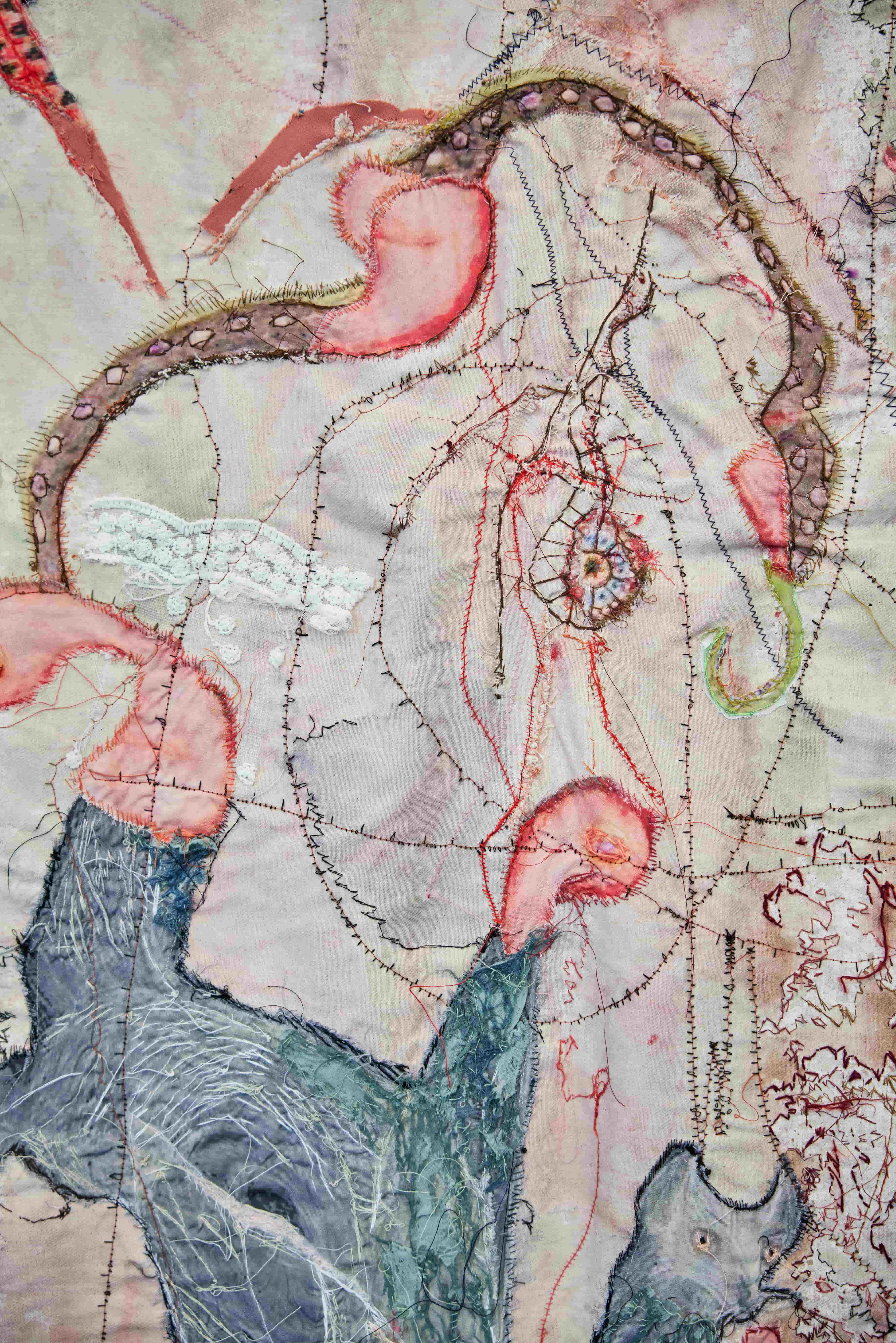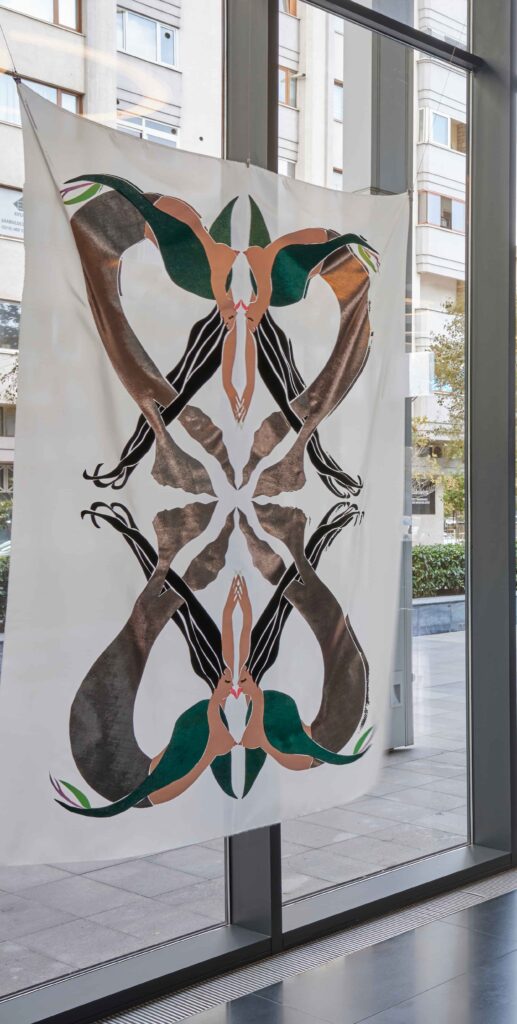 Kemancı’nın yapıtı, tülümsü bir materyal üzerine ilk bakışta bitkisel bir form hissi veren ancak yakınlaştıkça simetrik bir dağılıma sahip dört adet deniz kızının birleşimi olduğu anlaşılan ve bir anlamda çift anlatıya sahip bir yorum. Bulunduğu yer itibariyle içeriyle dışarı arasında ve mekanla iç içe geçen bu yapıt o yönüyle de uzak ve yakın okumalar içeren bir görünüm kazanıyor.