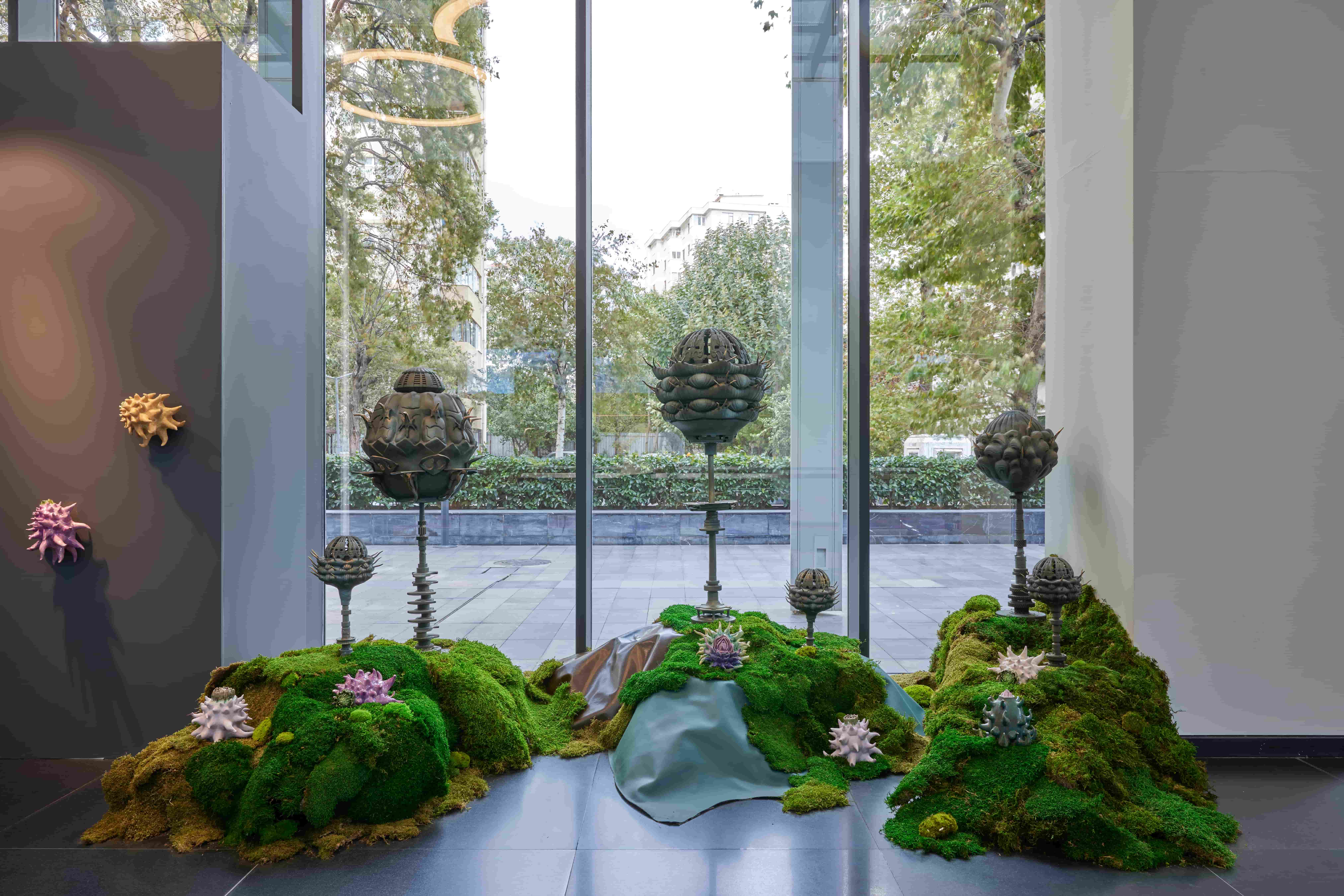 Şafak Şule Kemancı’nın mekâna özgü yerleştirmesi daha hafif, daha geçirgen bir tada sahip: Quick Tower’ın büyük camlarının ışığını içine çeken tülümsü bir yüzey. İlk bakışta orkideyi andıran ama yaklaştıkça tanımlanamayan organik form, doğanın taklidinden çok bir “belirme” hâlini taşıyor. Hem tanıdık hem yabancı; büfede bir çeşit “salata barı”: Hafif, ferah, ama yakından bakınca karmaşık bir düzen.