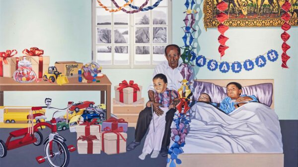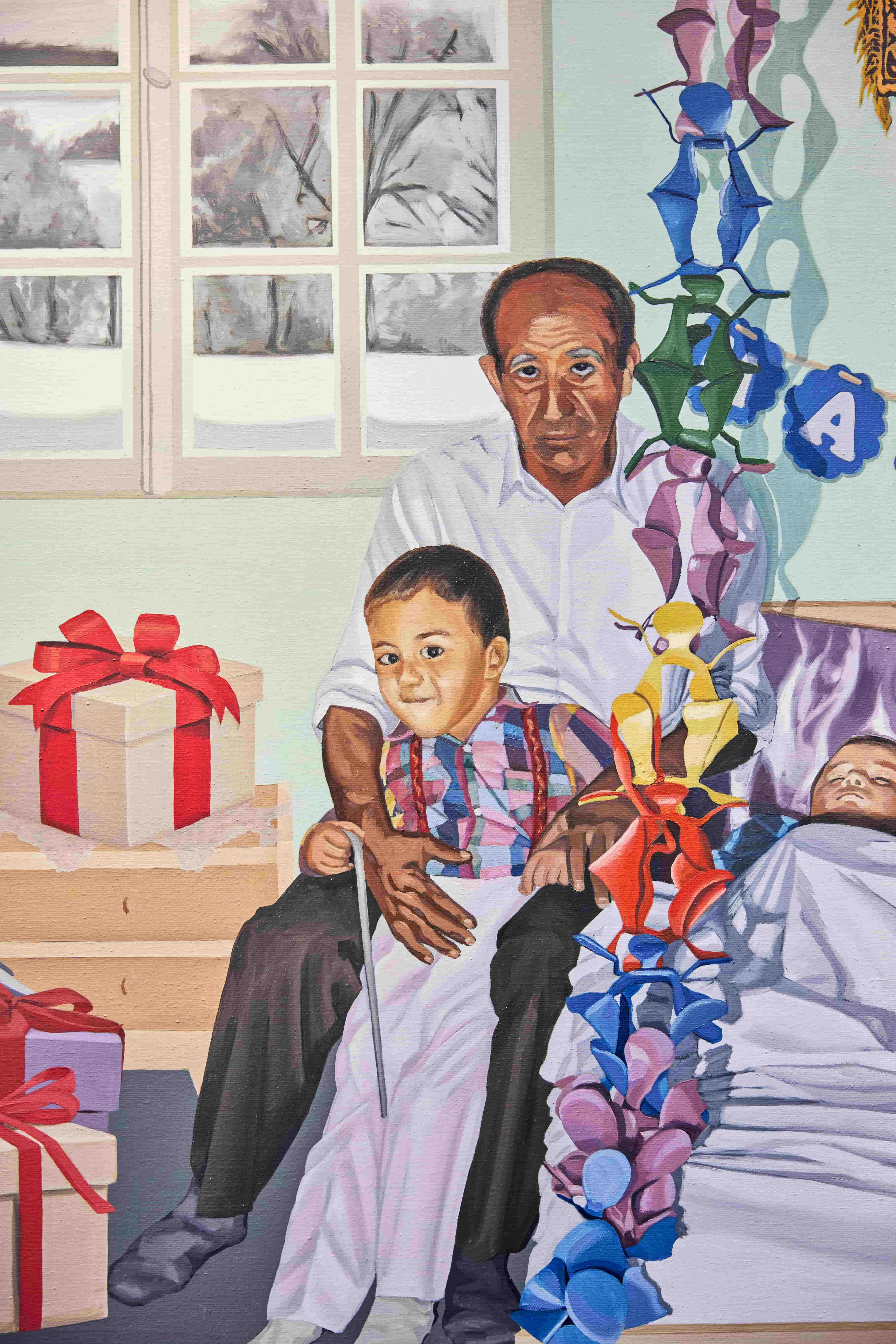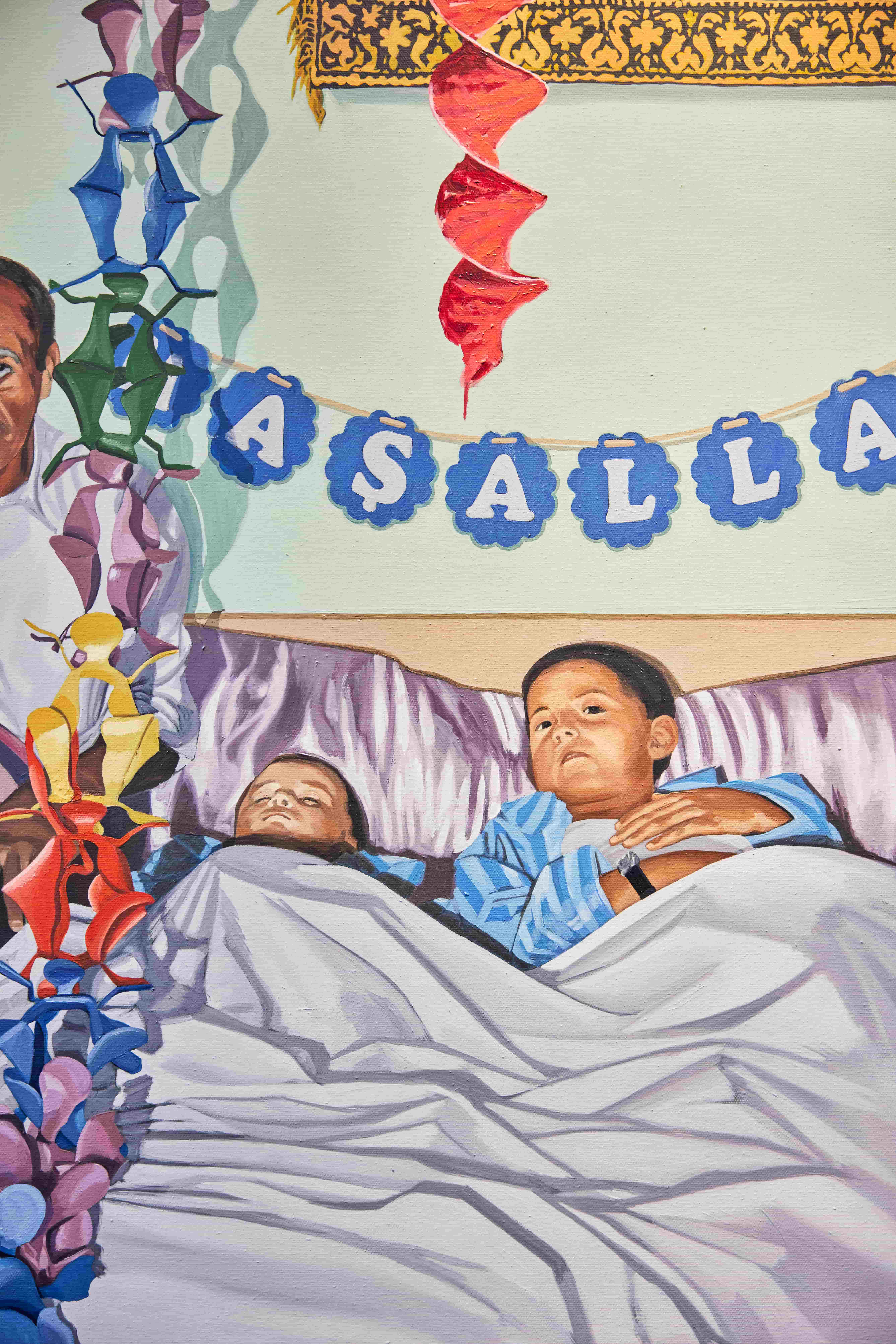 Seda Oturmak’ın Ödül’ü, toplumsal cinsiyetin nasıl çocuklukta kurulmaya başladığı üzerine sarsıcı bir yorum sunuyor. Nostaljik dekorasyonun altına gizlenmiş ataerkil kodlar, sergide âdeta “fazla baharatlı” bir tadı temsil ediyor: İlk anda çekici görünen, ama yaklaştıkça rahatsız edici. Çünkü Oturmak’ın steril bir biçim ile sunduğu hikayesinde seyircinin ilk karşılaştığı şey fotografik bir sünnet düğünü manzarası. Oysa yakınlaşıldığında her şeyin yerli yerine konulduğu ve kutsandığı hissini veren yapıtta, ilk önce orada olmaması gereken armağan paketleri dikkat çekiyor. Bu paketlerin resimdeki konumunu sorgulayan gözler yetişkin bir erkeğin kucağında oturan çocuğa çalındığında rahatsız edici bir figür adeta resimde tek başına kalıyor. Oturmak, tek bir çerçeveye birden çok anlamı çarpıcı ve iç içe yerleştirmeyi başarıyor. Oyuncakların erkek çocuklara bir ödül, bir “yetişkinliğe hazırlık kiti” olarak sunulması; yetişkin erkeğin çocuğu kucağında tutuşunun içerdiği saklı şiddet ihtimali; hepsi bu büfede katman katman açılıyor.