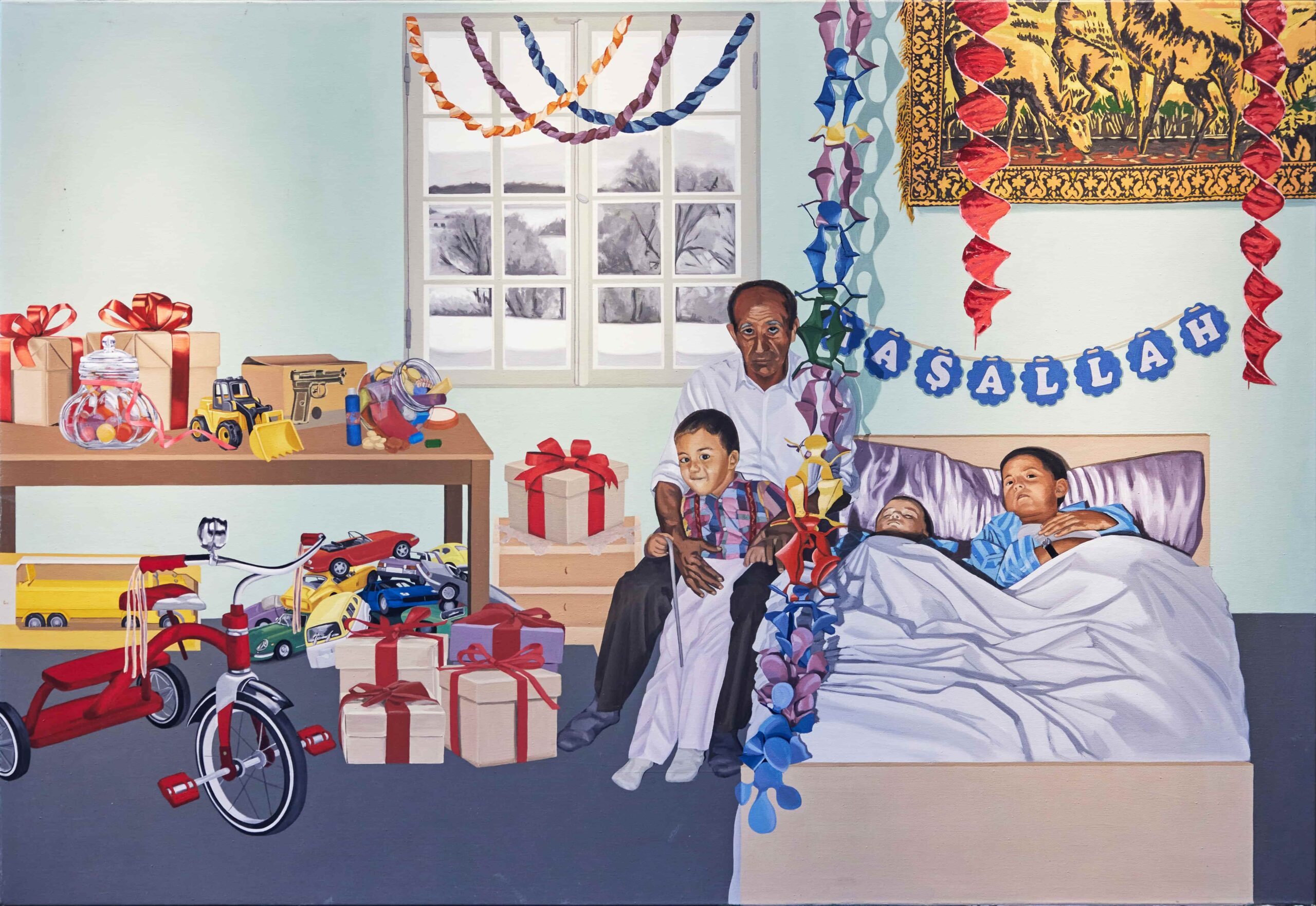 Seda Oturmak’ın Ödül’ü, toplumsal cinsiyetin nasıl çocuklukta kurulmaya başladığı üzerine sarsıcı bir yorum sunuyor. Nostaljik dekorasyonun altına gizlenmiş ataerkil kodlar, sergide âdeta “fazla baharatlı” bir tadı temsil ediyor: İlk anda çekici görünen, ama yaklaştıkça rahatsız edici. Çünkü Oturmak’ın steril bir biçim ile sunduğu hikayesinde seyircinin ilk karşılaştığı şey fotografik bir sünnet düğünü manzarası. Oysa yakınlaşıldığında her şeyin yerli yerine konulduğu ve kutsandığı hissini veren yapıtta, ilk önce orada olmaması gereken armağan paketleri dikkat çekiyor. Bu paketlerin resimdeki konumunu sorgulayan gözler yetişkin bir erkeğin kucağında oturan çocuğa çalındığında rahatsız edici bir figür adeta resimde tek başına kalıyor. Oturmak, tek bir çerçeveye birden çok anlamı çarpıcı ve iç içe yerleştirmeyi başarıyor. Oyuncakların erkek çocuklara bir ödül, bir “yetişkinliğe hazırlık kiti” olarak sunulması; yetişkin erkeğin çocuğu kucağında tutuşunun içerdiği saklı şiddet ihtimali; hepsi bu büfede katman katman açılıyor.