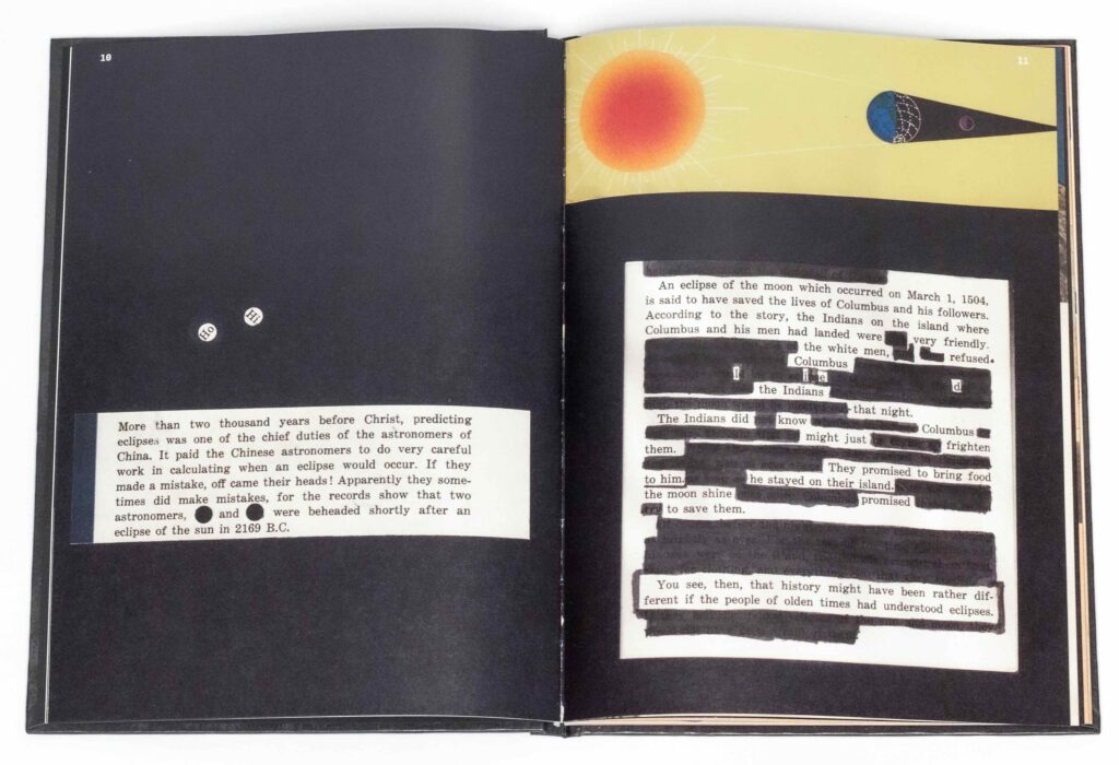 Kitabı, kalıntılardan toplanan metinlerden bir öğrencinin oluşturduğu sezgisel ve şiirsel bilgiye önem veren bir anti-okulun (anti okul bir tür okul, ancak alışılmış okulun tersine ezberci, didaktik, yönlendirici bir eğitim yerine sezgisel, şiirsel, özgürleştirici bir eğitim veriyor), gezi notları gibi kurguladım ve ona Kozmik Saha Gezisi (Cosmic Field Trip) ismini verdim. Kesip biçerek tutarlı didaktik tonu kırdım, metinlere şiirsel, hicivli, politik tavırlarla (sansürler, anlam kayması) müdahaleler edip onu dönüştürdüm. Kimi yerlerde metin mitolojikleşti. Our Nearest Neighbor’un yanına Earth a Great Storehouse (Dünya-Müthiş bir Depo), Light (Işık), ve Fire (Ateş) kitaplarını dönüştürerek oluşturduğum işler eklendi. Metaforik bir katmandan bu sıralama, modernitenin ulaştığı ve (sözde) aydınlanma sürecini takip ediyor. Öğrenci gökyüzüne bakıyor ve orada kozmik bir düzen bulmaya çalışıyor. Bu bölümde pek çok anlatıda hakikati temsil eden Güneş’in önünde bulunan ayın onun ışığını kestiği tutulma anlamına gelen “Eclipse” başlığını kullandım. Sıklıkla gökyüzünü incelediğimiz, tanrılar, gezegenler arasında ilişki kurmaya çalıştığımız, kozmosu araştırma tutkumuzu ve altında yatanları irdeliyor. Earth a Great Storehouse kitabı Mine bölümüne dönüştü. Aynı anda “benim” ve “maden ocağı” anlamına gelen bu kelime bölümün yer altındaki kaynak olarak gördüğümüz nesnelere (petrol, altın, değerli taşlar vs.) bakışımızı açıyor. Onların tasnif edilmesi, değer biçilmesi, araçsallaştırılması, tüketilmesi hakkında. Ardından Light kitabından oluşturulan Traces (İzler) bölümü karşımıza çıkıyor, ancak bir şeyleri göstermekten ziyade bakanı şaşırtıyor, görünen ve hakikat arasındaki farkı vurgulayan işler barındırıyor. Teknolojiyi ve icatlarımızı pek çok mitte temsil eden Fire ise modernitenin en büyük icadı savaş ve atom bombasından sonra kalanları hatırlatan Küller (Ashes) bölümüne dönüştü.