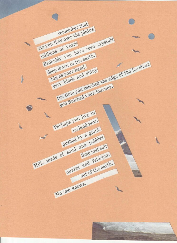 Stories Read from Rocks kitabından kesilmiş bu bölümde orijinal metin taşların oluşumundan bahsettiği için sıklıkla “binlerce yıl geçti”, “milyonlarca yıl sonra” gibi ifadeler var. Damla büyüyor, fosillerin, mercan mağaralarının, geniş ovaların üstünden geçiyor. Bebeklikten çocukluğa, yetişkinliğe geçen biri gibi. Bize sudan çıkan canlıların evrimleşerek karada çoğalmaya başlayışını hatırlatıyor. Bir damlanın bir kayayla mektuplaşması farklı mecralara dağılıyor. Metinsel bir şiir, seramik bir heykel, görsel bir kolaj.