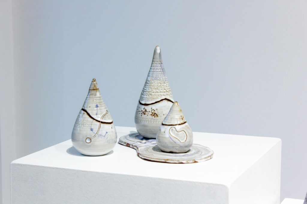 Damla nehire, göle, okyanusa, toprağa katılıyor; kara, bulut gibi farklı formlara giriyor. Bu onu dönüşüm fikrini işlemek için uygun bir metafor yapıyor. Elbette öncelikle doğmalıydı, ancak bu doğuş dev bir döngünün içerisinde bir parça olmalıydı, sürekli doğmalıydı. Devinen yağmur damlası için bu zaten son derece doğal. Yeniden doğuşun psikanalitik olarak insanın her dönüşümde yeniden başka biri olarak meydana gelmesi, Platon’un Timaeus diyaloğundaki “Khora” vasıtasıyla evrenin tıpkı kuantum alanlarındaki gibi sürekli meydana geliş hali gibi diğer düşünceler de bu türde sürekli bir doğuş hâlini destekliyor. Serginin başında bulunan seramik işler içlerinde özgün bir cevher barındıran bir hazne olarak damlayı ele alıyor.