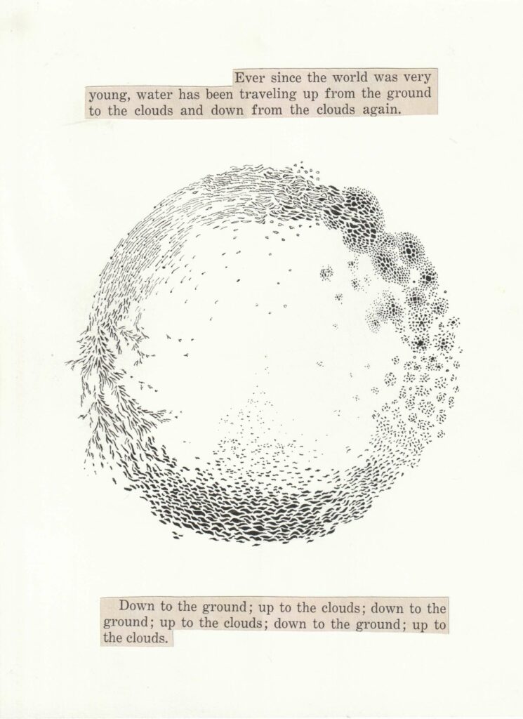 Cosmic Field Trip kitabını ürettikten sonra yine aynı yayınevinin aynı serisinden Clouds, Rain and Snow isimli kitapla karşılaştım. Mevsimleri ve hava olaylarını, yağmuru, bulutları anlatmayı hedefleyen bir kitaptı ve onun içerisindeki yağmur damlasını devamlılık gösteren bir karakter olarak kullanıp, onun geçtiği mekanlar vasıtasıyla dönüşümü üzerinden hem mitolojik, hem psikanalitik, ve felsefik katmanların iç içe geçtiği bir ruhsal dönüşüm hikayesi anlatma fikri aklıma geldi. Metinler arasındaki ardışıklığın ön planda olduğu, bölüm bölüm kurgulanmış, ve teknik açıdan Cosmic Field Trip’e benzer bir üslupla oluşturulmuş bir çalışma hayal ettim.