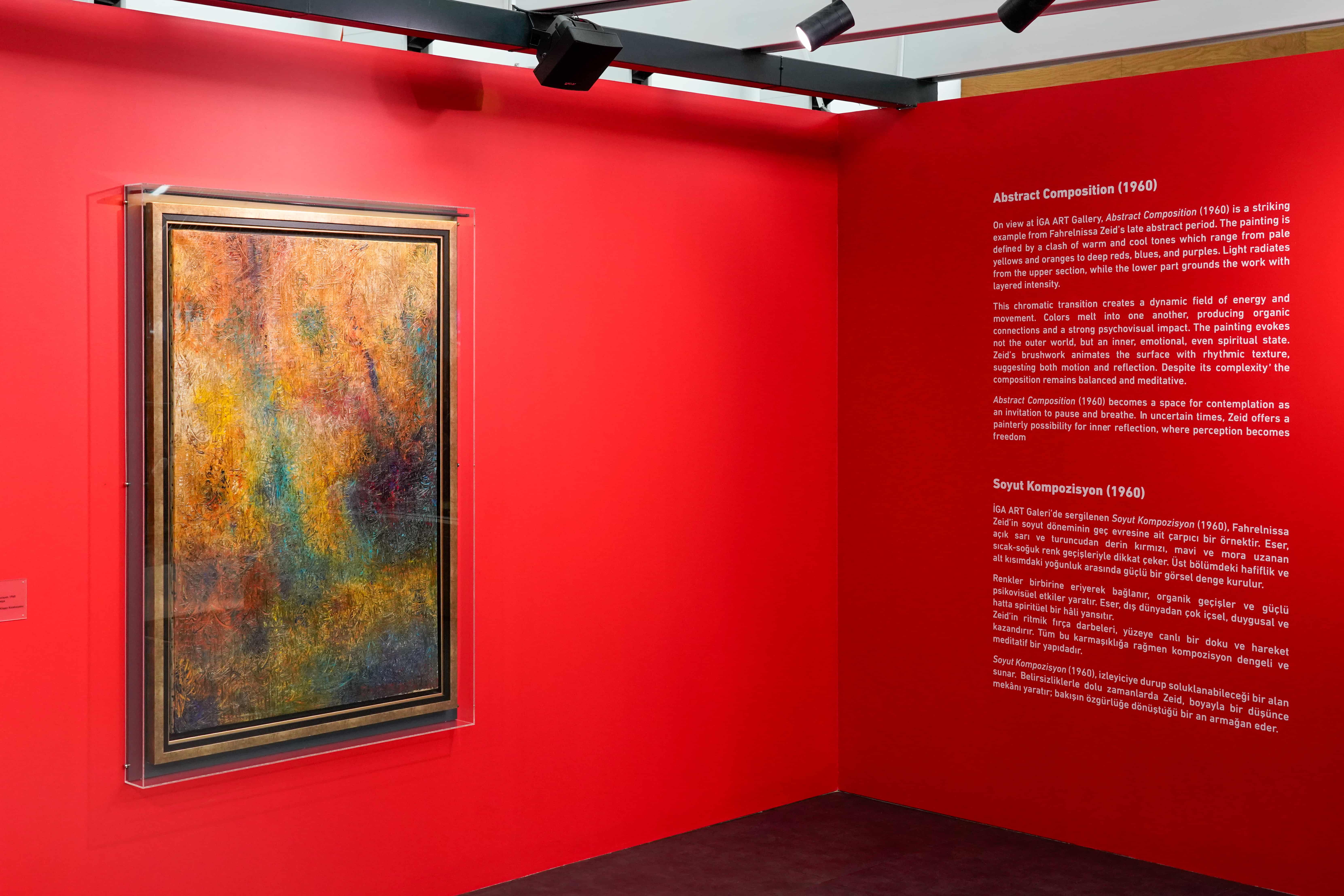 1960 tarihli Soyut Kompozisyon, Fahrelnissa Zeid’in figürasyonu tamamen geride bıraktığı ve soyut sanatın ifade gücünü kendi içsel dünyasıyla birleştirdiği olgunluk dönemine ait çarpıcı bir örnektir. Eser, üst yarısında yer alan açık sarı ve turuncu tonların yarattığı aydınlık ve enerjik atmosfer ile, alt yarıdaki koyu mavi, mor, bordo ve yanık kırmızı tonların oluşturduğu ağırlıklı, neredeyse karamsar bir alan arasında kurulan gerilimle dikkat çeker.
