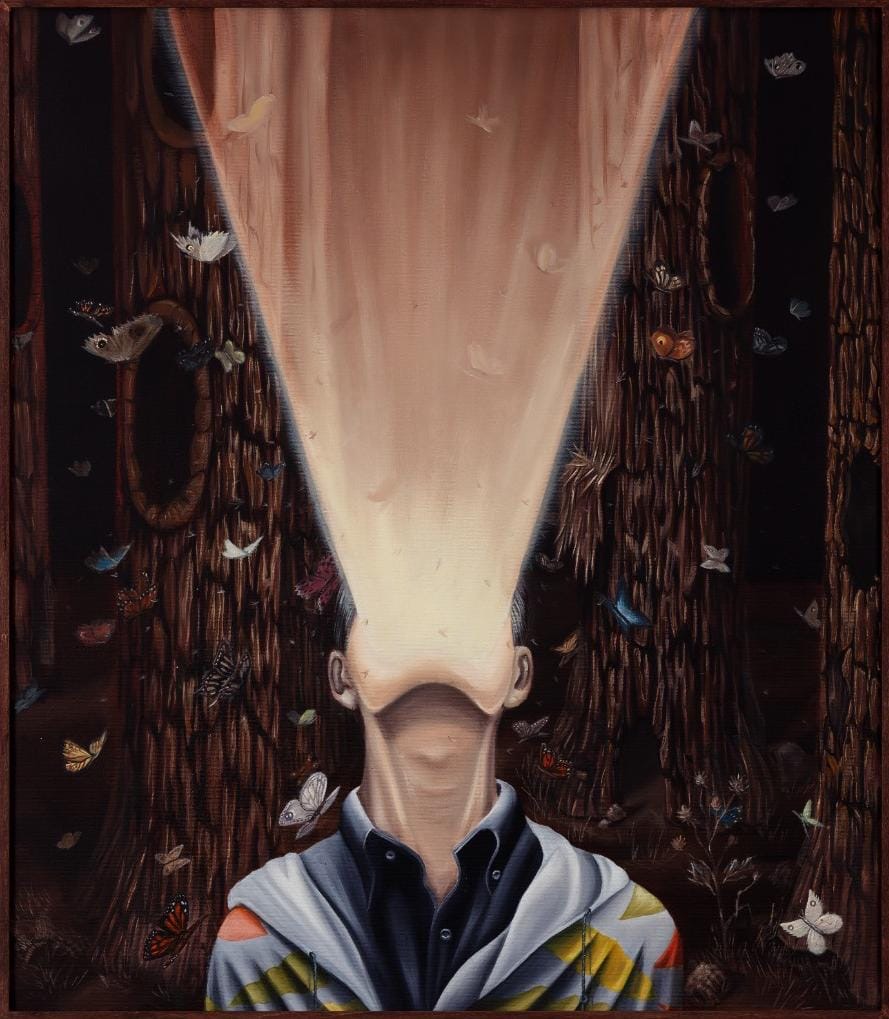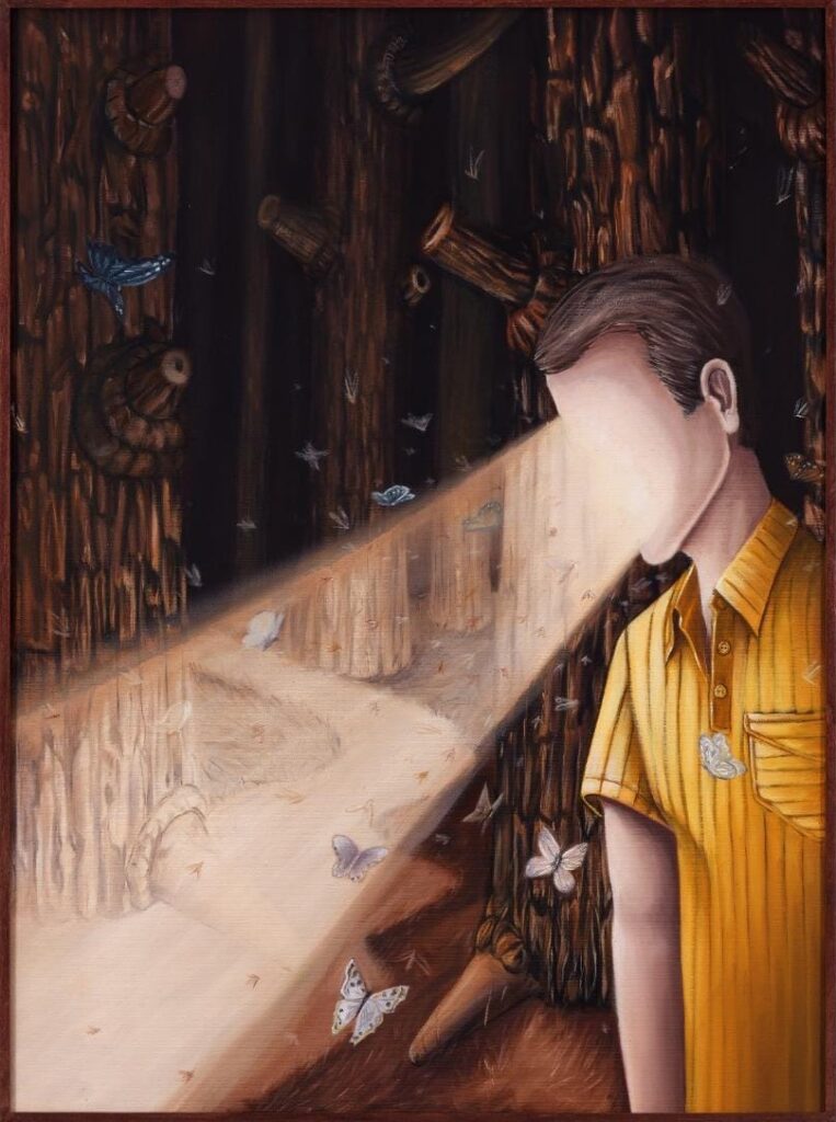 Özen’in “Dünyadan Uzak” adını verdiği evrenine adım atarken zihnim bu düşüncelerle meşguldü. Karşıma ilk çıkan iş, üç yağlıboya tuval ve bir 3D videodan oluşan Tuzağa Yakalanmak serisiydi. Karanlık bir orman fonunda, ağaç dalları arasından süzülen kelebekler, yüzü olmayan figürlerin baş hizasından yükselen ışık huzmelerine ve dolayısıyla kaçınılmaz yok oluşlarına doğru ilerliyordu. Kırılganlıkları ve geçicilikleri onları kimliksiz insan figürleriyle özdeş kılıyordu; resmedilen insanlar da aynı biçimde sonlarına yürür gibiydi. Yüzlerinde patlayan propaganda spotlarının ışığıyla ve silinmiş benlikleriyle, politik iklimin gerginliğinde kimseyle iletişim kuramayan bu figürler, bastırılmış arzuların ve bilinçaltının karanlığını çağrıştıran ormanın içinde hapsolmuş bir hâldeydiler. Kelebeklerin estetiği ise onları ölüm fikrine daha sıkı sıkıya bağlıyordu; tıpkı vanitas tablolarındaki çiçek, kum saati ve kuru kafa üçlemesinin izleyiciye “Çok güzelsin ama öleceksin” mesajını iletmesi gibi, bu iki çelişkili kavram da serinin merkezinde yer alan tuzak fikriyle birleşiyordu. Serideki video, bana Roland Barthes’ın Camera Lucida’da fotoğraf hakkında söylediklerini düşündürdü. Barthes, fotoğrafa bakışını belirleyen niyetin ve fotoğrafın özünün ölüm olduğunu öne sürer ve şehvetle sevdiği tek şeyin makineden çıkan metalik sesler olduğunu belirtir. Zamanın seslerinin kendisine hüzün vermediğini çünkü içindeki çok yaşlı birinin o fotografik mekanizmada “ağacın yaşayan sesini” duyduğunu yazar.