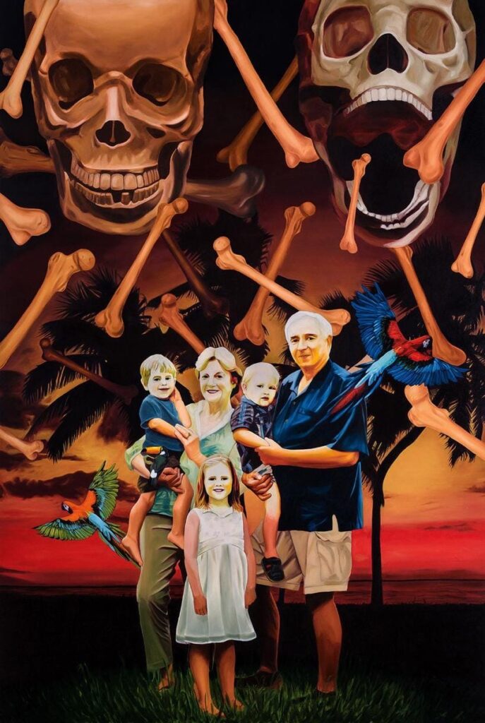 Gel Beraber Olsun’da aileye dair eğlence imgeleri ile bariz ölüm simgeleri arasındaki gerilim, klasik vanitas temasının çağdaş bir yorumunu barındırıyordu. Anatomik özelliklerinden giysilerinin renklerine kadar kendilerinin birer sureti olan torunlarıyla poz veren hipergerçekçi görünüme sahip ailenin mutluluğunun geçiciliği, yaşlı çiftin yaklaşan ölümünün kuru kafalar ve kemikler eşliğinde hatırlatılmasıyla dengeleniyordu. Ancak elbette, tablonun kompleks yapısı bir memento mori’ye indirgenemezdi. Mutluluğun ve güzelliğin yok olacağı gerçeği yapıtın sadece ilk katmanına aitti. Aile fotoğrafı estetiği aracılığıyla eserin arka planında gizlenen şiddetin günlük hayat içinde nasıl normalleştirildiğine de tanıklık ediyorduk. Gülen yüzler, temiz giysiler, beyaz bedenler; görünürde her şey olması gerektiği gibiydi. Ancak bu kusursuz imaj dahi, sistemin arka planda biriken kemikler ve kafatasları üzerine kurulu olduğu gerçeğini gizleyemiyordu. Belki de bu ideal aile fotoğrafı, yıllar süren şiddetin ya da bastırılmış travmaların üzerine bina edilmişti. Aile içi şiddetin yapı taşı olduğu bir düzende, ortalıkta görünmeyen ebeveynler ya da izleyiciye bakan torunlar, bu kadrajın kurulabilmesi uğruna görünmez anlaşmalara boyun eğmişti.