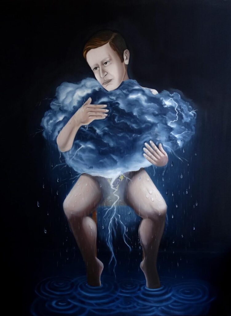 Sergi bir tuval ve bir videodan oluşan Sevgili Yalnızlığım duosuyla devam ediyordu. Kucakladığı yüklü buluttan yağan yağmurun oluşturduğu gölün ortasında, “dünyadan uzak”, bir sandalyede tek başına, iç çamaşırıyla oturan adam Barthes’ın “ölümün kaydı” olarak adlandırdığı o fotoğraf karesinden fırlamış gibiydi. Bu erkek figür öylesine masum bir görünüme sahipti ki, akla ister istemez Alice’in tavşan deliğinde korkudan döktüğü gözyaşlarıyla oluşturduğu o derin havuz geliyordu. Psikolojik olarak açığa çıkarılmıştı, savunmasızdı ve teşhir edilmişti. Bir poz veriyordu ama daha o pozu verirken çözülmeye başlıyor, bedeni yavaşça buharlaşıyordu. Jung’un anılarında kullandığı bulut imgesi -“Bir an için çok yoğun bir bulutun içinden çıkmışım gibi bir duyguya kapıldım ve o anda ‘kendimi’ bulduğumu anladım”- burada tersine çevrilmişti. Figür bulutun içinden çıkamıyor, onunla bütünleşiyor, fiziksel formunu yitiriyordu.