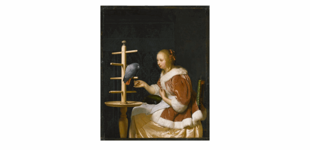 Papağanlar ve benzeri egzotik kuşlar, yalnızca sömürge estetiğini değil; kadın cinselliğini, hazcılığı ve bekâreti de dolaylı biçimde ima ediyordu. Özellikle boudoir (giyinme odası) temalı sahnelerde günlük yaşamı betimleyen Van Mieris, Gabriël Metsu, Gerrit Dou gibi 17. yüzyıl Hollandalı ressamların tablolarında, kadın modele çoğu zaman bir papağan eşlik ederdi. Egzotik kuş, bu domestik dekorda kadın için bir sırdaş, bir yoldaş rolü üstleniyordu. Kadını yerine getirmekle yükümlü olduğu ev işlerinden alıkoymayacak, az da olsa konuşma yetisi bulunan, bir kadın için yeterli addedilecek türden sosyal etkileşimi sağlayan varlıklar olarak algılanan papağanlar, vahşi doğaları ve rengârenk görünümleriyle bir evin güvenli sınırları içinde kadınla arkadaşlık ederken, aynı zamanda onun tehlikeli arzularını paylaşarak bir denge sağlıyorlardı. Söz konusu Hollandalı ressamların tabloları arasında, Caspar Netscher’in Papağan Besleyen Kadın’ı, modelinin cilveli bakışları, baştan çıkarıcı gülüşü ve kafesten tamamen salınmış papağanıyla dikkat çekiyor; pozun şehvetiyle kuşun özgürlüğü birleşince masumiyetin çoktan bozulduğu, bekaretin yitirildiği izlenimini uyandırıyordu.