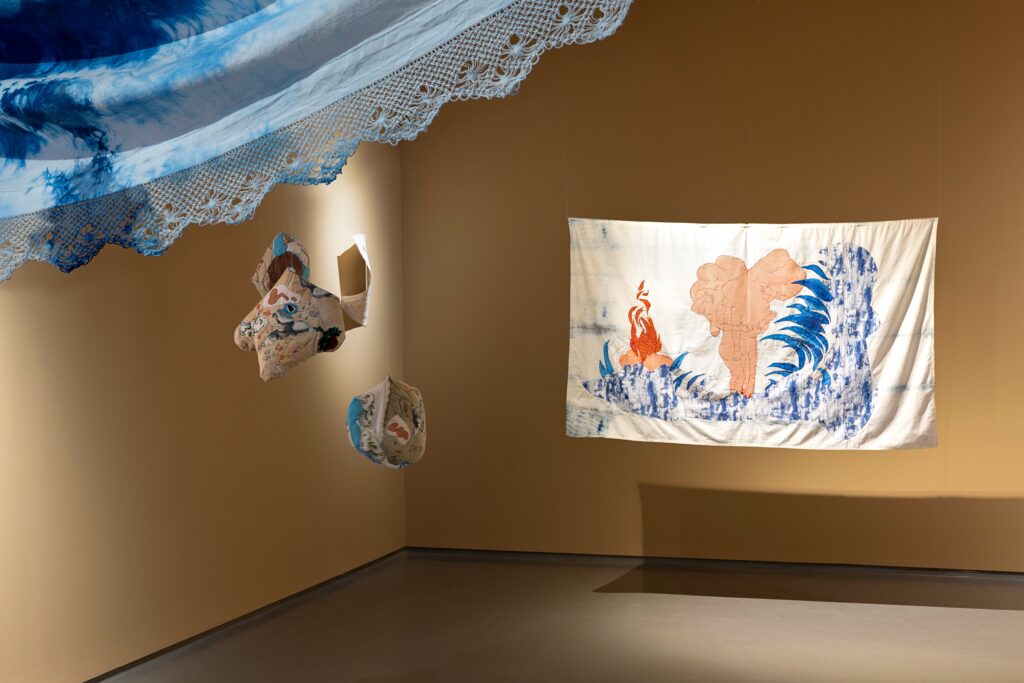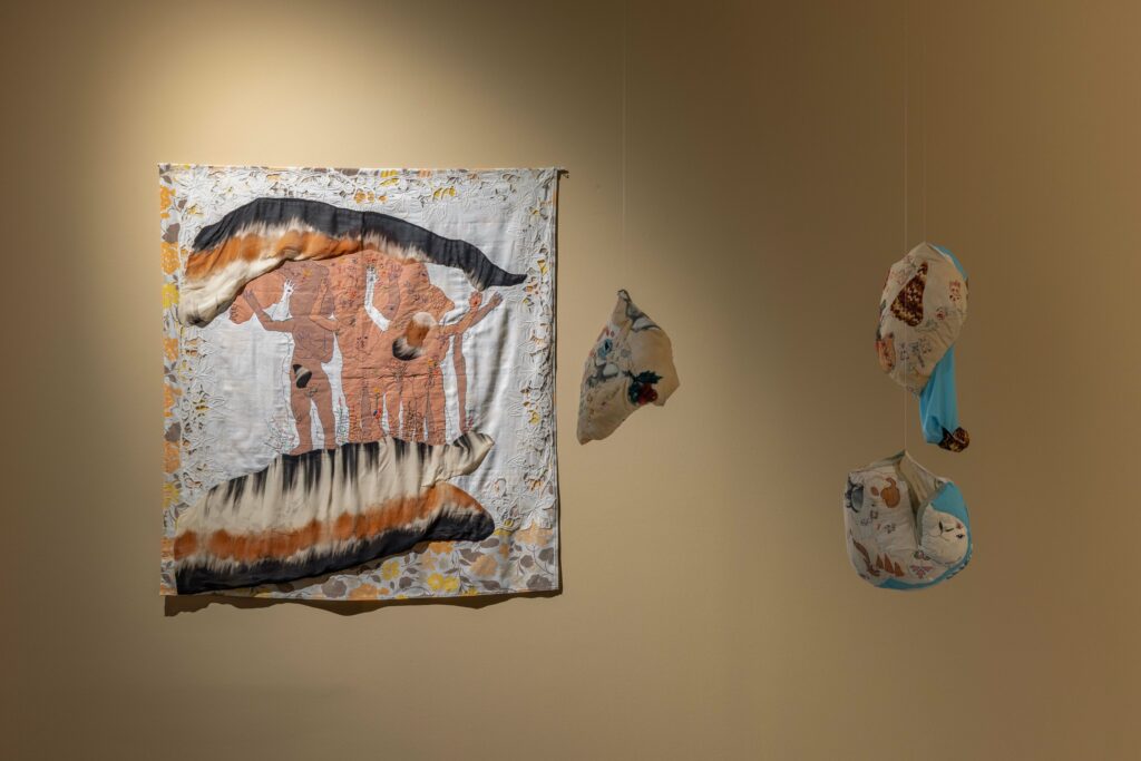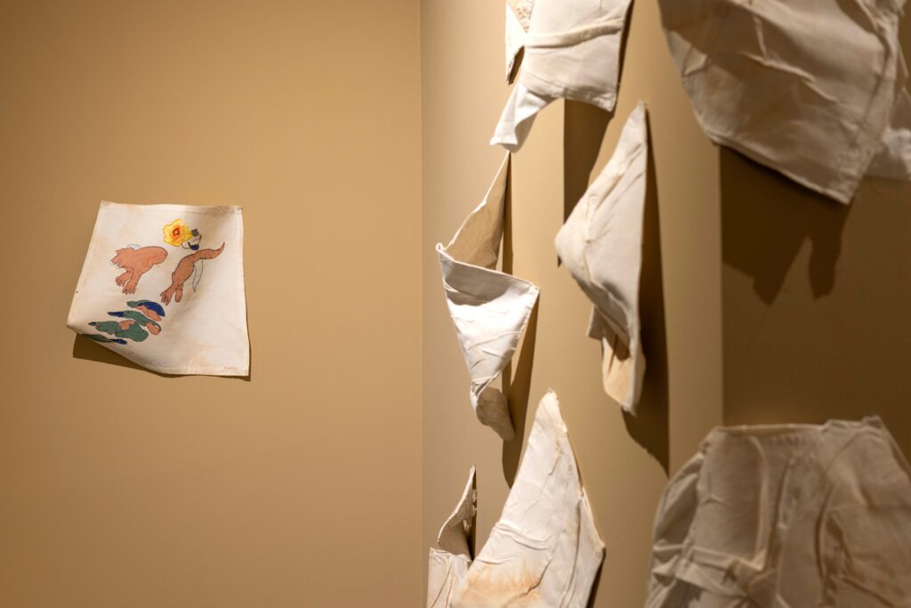 Serginin en güçlü öğelerinden biri kumaş. Kumaş burada biçim veren bir araçtan çok, düşünmenin ve üretmenin edimleştiği bir hâle dönüşmüş. Katlanan, buruşan, açılan ve yer değiştiren kumaş yüzeyler, formsuzluğun bedenleşmesini mümkün kılıyor. Form, tamamlanmış bir sonuçtan ziyade, eylemlilikler arasında geçici bir durak olarak ortaya çıkıyor.
