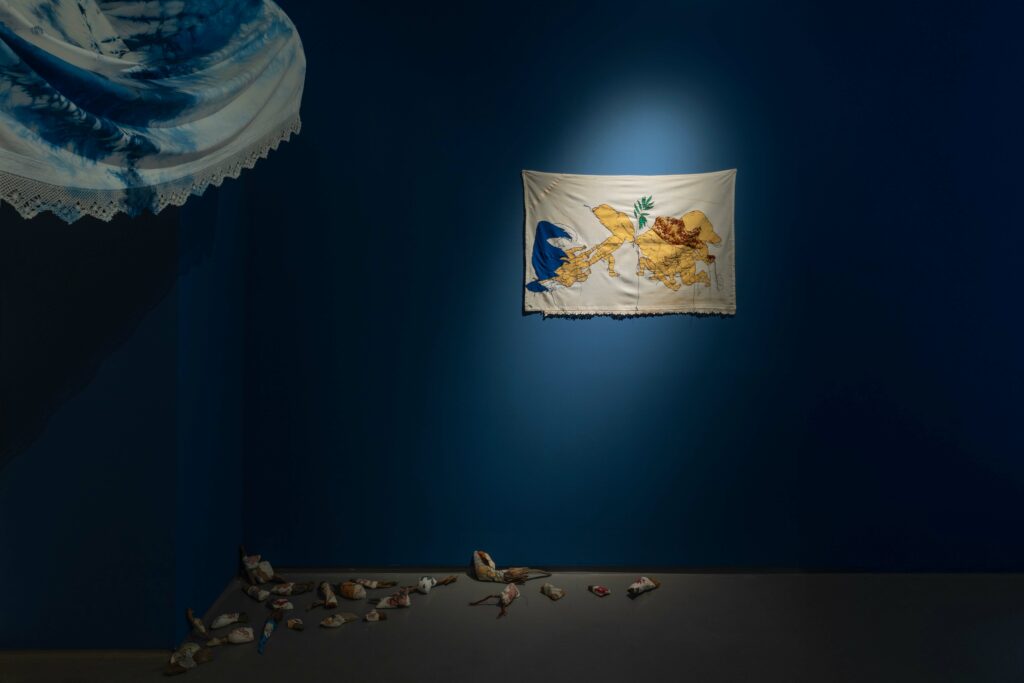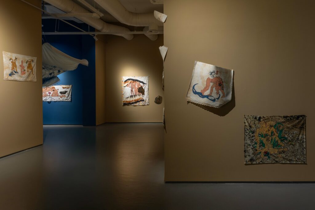 Sergi mekânının sergi için duvar renginin değiştirilmesi, mekânı nötr bir sergileme alanı olmaktan çıkarıyor. Mekân, sanatsal nesnenin bir parçası hâline geliyor. Bu müdahale, mekânın da tıpkı kumaş ya da taş gibi eyleyen bir unsur olduğunu vurguluyor. Burada yerin jesti ile suyun jesti birbirine yaklaşıyor. Gelgit, yalnızca doğasal bir döngü değil; mekânın, bedenin ve maddenin birlikte kurduğu bir oluş hâli. Varlık algısı, mekânsal deneyim yoluyla bedenleşiyor.