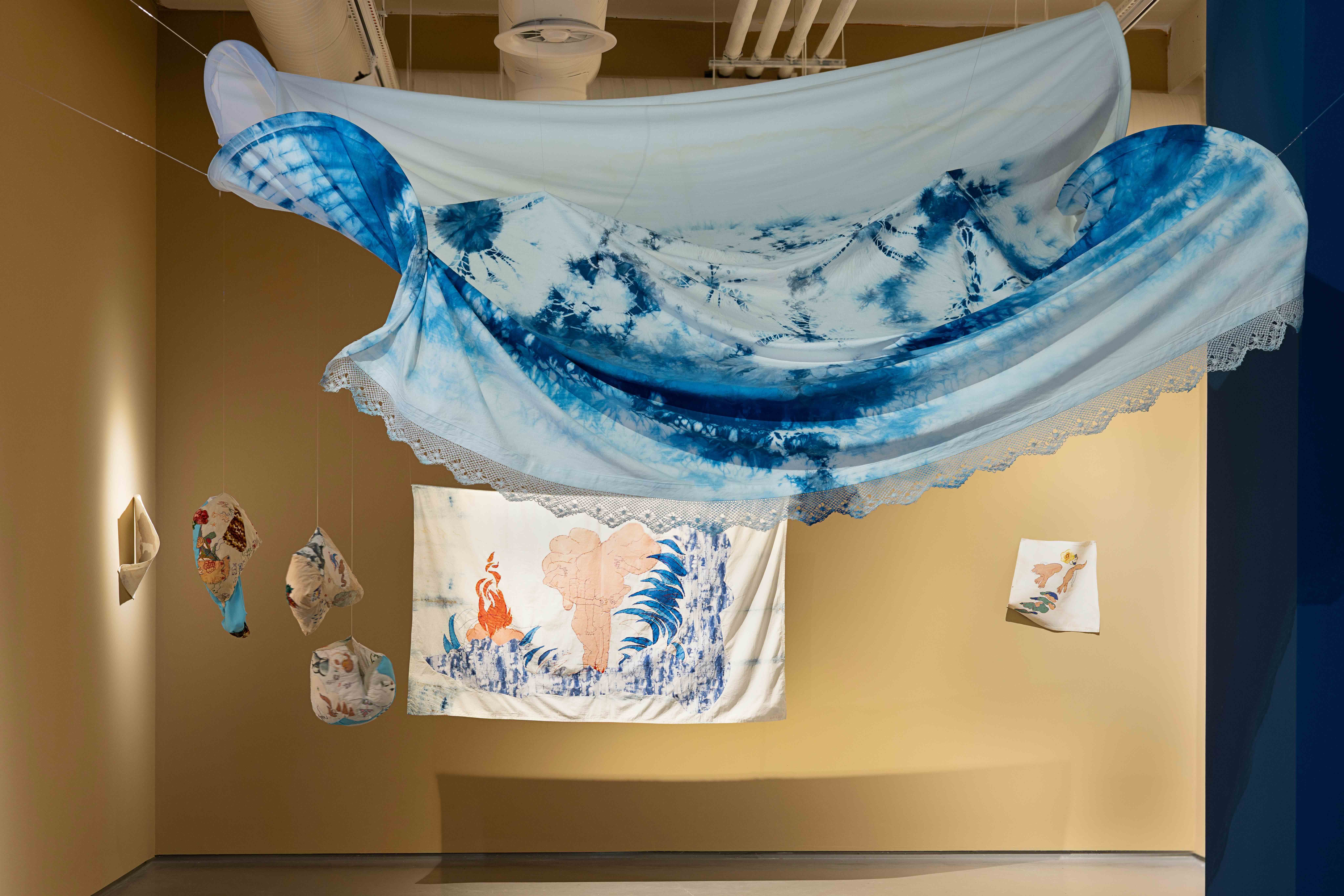 Serginin en güçlü öğelerinden biri kumaş. Kumaş burada biçim veren bir araçtan çok, düşünmenin ve üretmenin edimleştiği bir hâle dönüşmüş. Katlanan, buruşan, açılan ve yer değiştiren kumaş yüzeyler, formsuzluğun bedenleşmesini mümkün kılıyor. Form, tamamlanmış bir sonuçtan ziyade, eylemlilikler arasında geçici bir durak olarak ortaya çıkıyor.