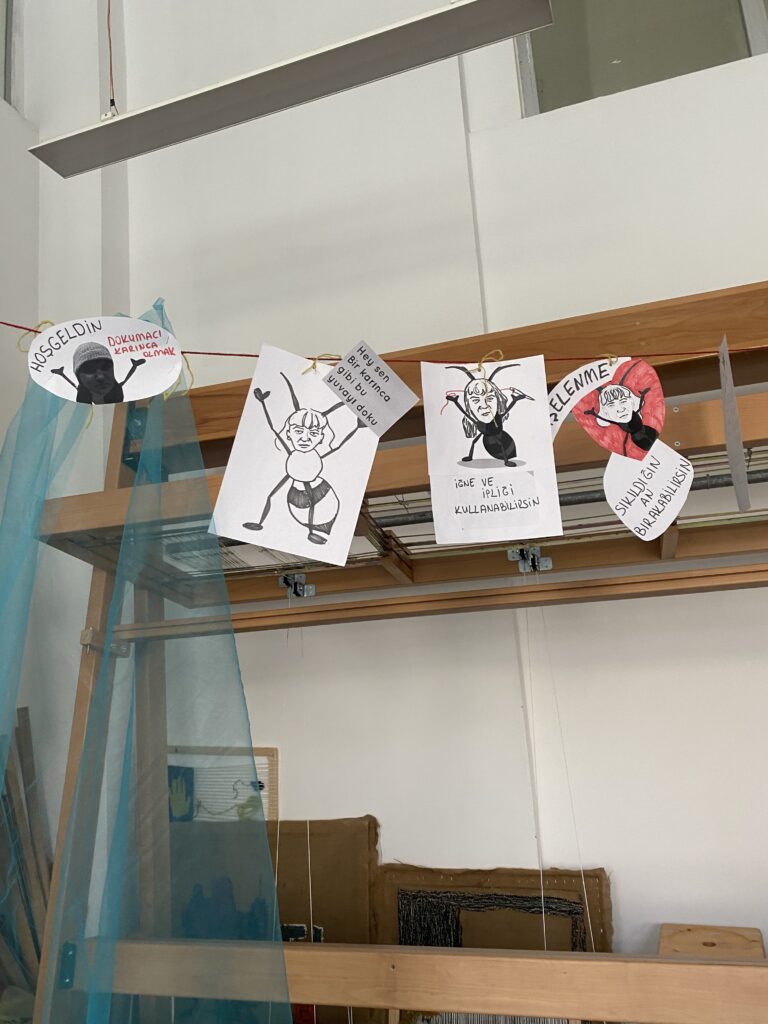 Sergi, Halı Atölyesi’nin yalnızca “eğlenceli”, popüler kültüre içkin anlarına, görüntülerine, sloganvari jestlerine, yani çabuk tüketilebilir, sosyal medyada hızlıca paylaşılabilir taraflarına odaklanırken Halı Atölyesi’nin kavramsal boyutlarını, Gülçin Aksoy’un Halı Atölyesi’nde yönettiği tezlerin “mühim” taraflarını göz ardı etmiş gözüküyor. Aksoy’un ders notlarının ve Halı Atölyesi müfredatının serginin hiçbir bölümünde yer almaması da önemli bir eksiklik olarak karşımıza çıkıyor.[4] Öte yandan, sergide yer almayan unsurların kamusal programlar aracılığıyla telafi edilebileceğine dair bir umudum vardı.[5] Ancak 6 ay boyunca süren serginin kamusal programı olarak yalnızca Hazavuzu’nun performanslarına, “yumak buluşmalarına”, bir eleştirel sergi turuna, kukla-renk vb. atölyelere yer verildi. Böylece Halı Atölyesi yalnızca performansların yapıldığı, dev bir ponponun üretildiği bir yere indirgenmiş oldu.