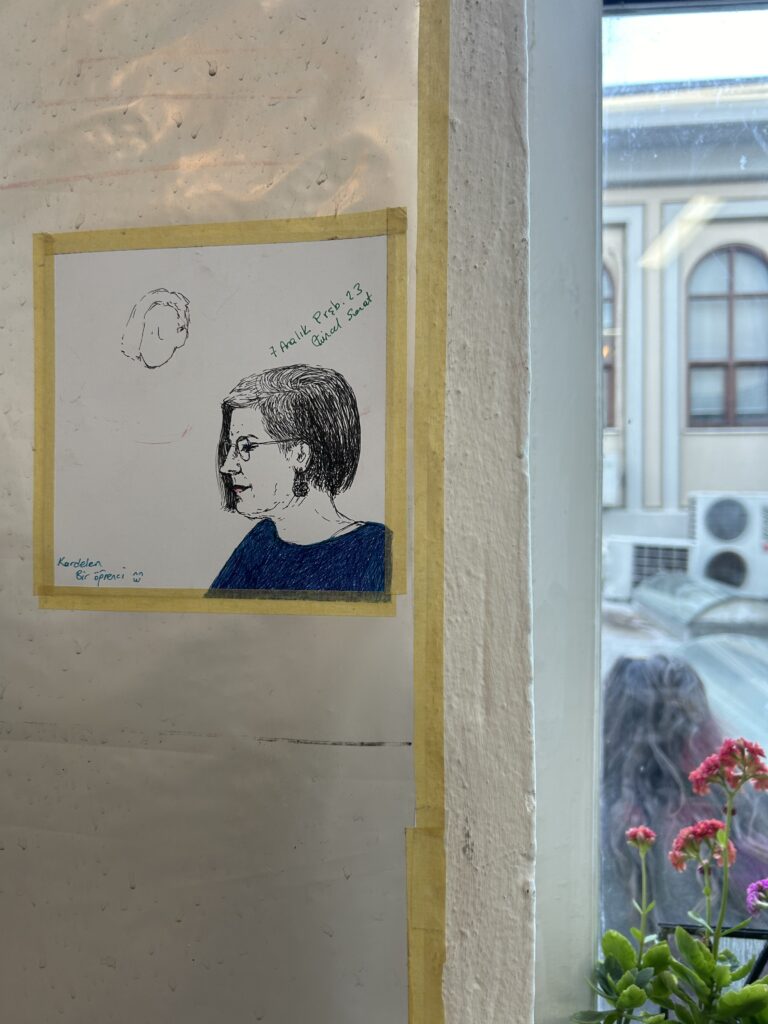 Serginin, Halı Atölyesi’nden güç almış pek çok kişiyi dışarıda bıraktığını, kendi deneyimim üzerinden anlatabilirim. Serginin açıldığı gün, 18 Eylül 2025 Çarşamba, Hakan Cingöz’ün Bina döneminde yaptığı 13 portre dikkatimi çekmişti. Bu portreler arasında Gülçin Aksoy, Gökçe Erhan, Betül Bolat, Furkan Akhan gibi tanıdık yüzler yer alıyordu. Cingöz, Halı Atölyesi’nin bir uzantısı gibi görülebilecek olan Bina[13] döneminde Bina sakinlerini ve müdavimlerini resmetmeye başlamıştı. Bina’ya çok sık gittiğim için, Cingöz benim de bir portremi yapmıştı. Sanatçı sergilenmek üzere Bina’yla ilişki kurmuş kişilerin portrelerini, dolayısıyla benim portremi de yanında götürmüş ancak küratörün kararıyla 3 portre dışarıda bırakılmış. Bina’nın müdavimlerinden biri olmam dışında, o dönem Bina hakkında yapılmış yazılı tek röportajın[14] müellifi olarak portremin dışarıda bırakılma gerekçesini merak ediyorum. Küratörlere e-posta atıp sorduğumda, Akbıyıkoğlu röportajın gözden kaçtığını kabul ediyor: “Gündelik hayata dair tatlı ve çoğu zaman gözden kaçan bir detay olarak Huzur apartmanına su getiren çocuğun portresini eklediklerini, Kam’ın (Atakan) portresi de serginin Garip Bir Pandik bölümlerinde de katkısı olan bir fotoğrafçı olarak farklı bölümlere bir ilmek atma arzusuyla yer aldığını” iletiyor. Duvarda başka ilmekler atacak yeteri kadar yer var aslında; bu açıklamayı pek anlayamıyorum. Ayıklayan, kendince “iyisini, kaydadeğer olanı” seçen bir yaklaşım bu.