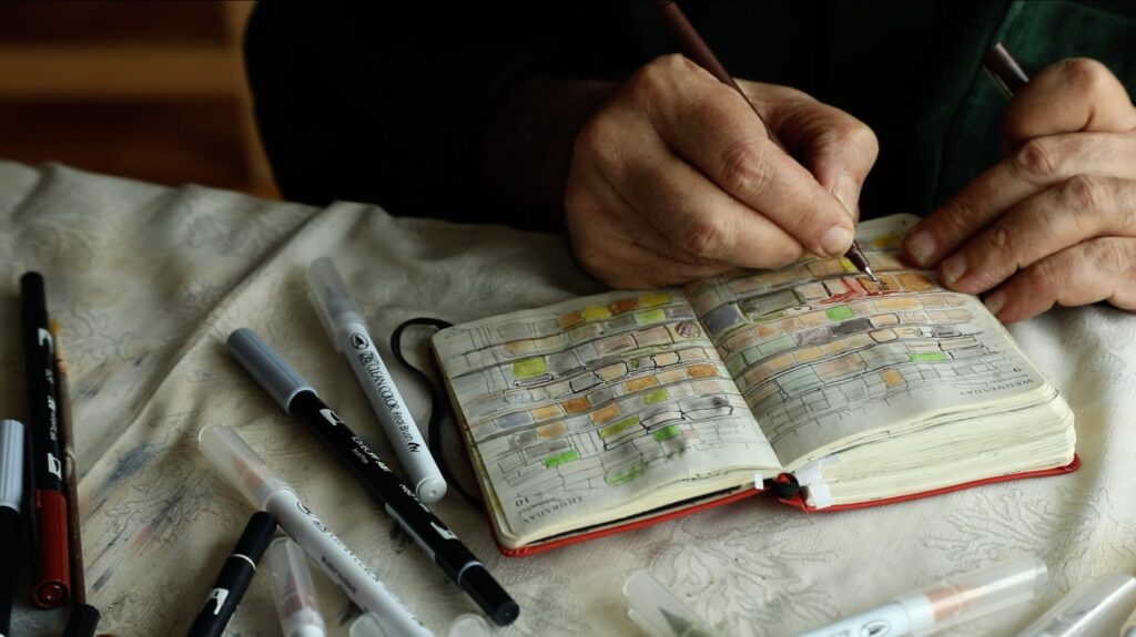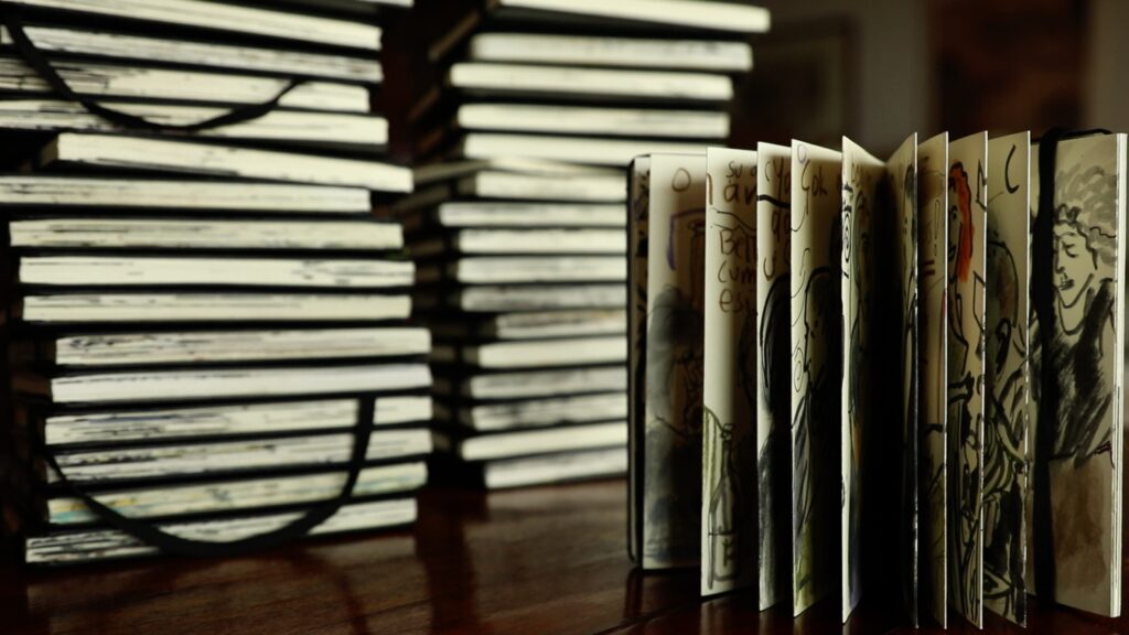 Kazma: Evet, bu sergide ilk kez kendi defterlerimi göstermenin yanı sıra bazı özel objelere de yer verdim. Örneğin, kaligraf Ömer Faruk Dere’nin çizdiği “elif” harfini videoda görebilirsiniz. Sekiz tane elif çiziyor, hiçbirinden memnun kalmıyor. Son çizdiğini beğeniyor ve onu bana hediye ediyor. O çalışmayı çerçeveletip sergiye astık.