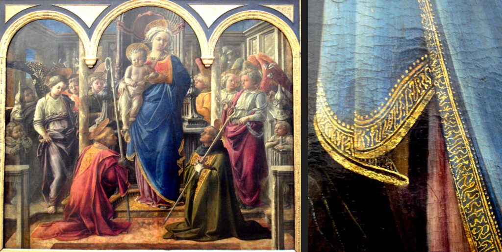 Louvre’da sergilenen Filippo Lippi’nin Pala Barbadori (1438) adlı eserinde Meryem’in mantosunun etek ucunda Arapça harfler içeren bir yazı yer alır. İlk bakışta kutsallığı çağrıştıran bu şerit, dikkatle bakıldığında okunaksızdır. Harfler tanıdık görünür, fakat anlamlı bir kelime grubu yoktur. İşte bunun adı Pseudo-Kufic, yani taklit Kûfî yazısıdır. Aynı durum, erken döneme ait bir örnek olan Giotto’nun Meryem ve Çocuk İsa (Madonna and Child, yaklaşık 1310–1320) eserinde de görülür. Meryem’in giysisindeki Arapçayı andıran fakat okunamayan bu yazılar, Pseudo‑Kufic geleneğinin Rönesans’tan önce de Batı resminde mevcut olduğunu gösterir. Antonio Vivarini’nin Saint Louis de Toulouse (1450) tablosunda ve Jacopo Bellini’nin Virgin of Humility (1440) adlı eserinde de bu motif tekrar eder. Meryem’in giysisini çevreleyen bu yazılar, İslam dünyasına ait ‘yabancı’ bir dilin Batı resmine yalnızca görsel bir iz olarak taşındığını gösteriyor. Burada Arapça bir dil değil, bir süsleme olarak kullanılmış. Orta Doğu, bu dönemlerde Batı için; yaşayan, var olan bir kültür değil, yalnızca estetik olarak göze hitap eden bir süsleme kaynağı olmuş sanatta.