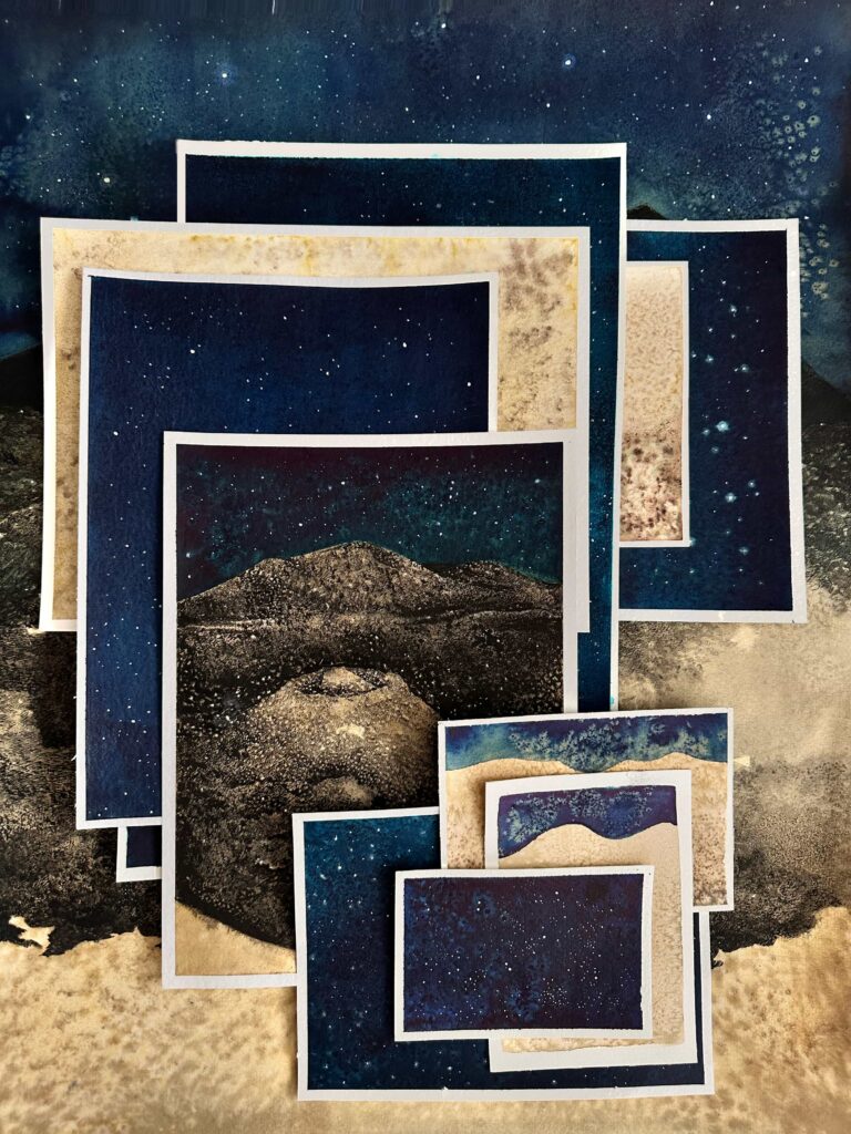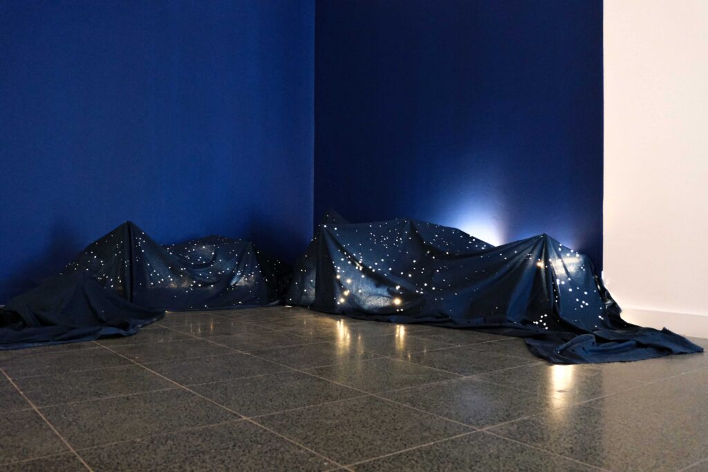 Sergiyi oluşturan yapıtların -belki çorak topraklar üzerinde dolunay ve yıldızlarla ışıl ışıl bir gece göğünü betimleyen İsimsiz pentürü hariç- tamamı farklı örtme biçimlerini ele alıyor. Örneğin Kayıp Işığın Gölgesi isimli mekâna özgü yerleştirme, buluntu nesnelerin üzerini örten mavi bir kumaştan oluşuyor ve galerinin kasten perdeyle karartılmış iç mekânında maviye boyanmış iki duvarın alt kısmını işgal ediyor. Bu yapıtta sanatçının daha önce inşa ettiği -“Yıkıntılar Arasında” (2024, Barın Han) sergisinde görme şansına eriştiğim (ismiyle müsemma) Kıyıya İtilmiş Işıkların Mutluluğu isimli video gibi- yapıtlarındaki kenara itilmişlikle kurulan bağı görmemek mümkün değil. Yine bir yığın nesne, bu defa değersizlik tesiri üretecek bir düzensizlikle kenara atılıvermiş.