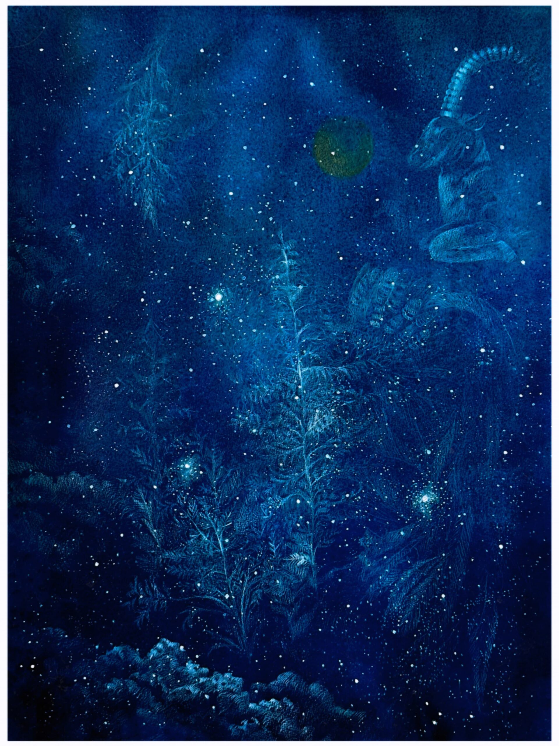 Hüzme serisinde mavi mürekkepli katmanlarda oluşturulan ve koç başı, bitkiler gibi unsurlar da içeren imgeler bu katmanların altında yine hayaletvâri bir yaşama kavuşurken katmanlar parlak, yıldıza benzer beyaz ışık hüzmeleriyle delik deşik hâle geliyor. Fakat artık bu ikisi arasındaki ilişki, dışlayıcı bir süreksizlik değil; yapıtın inşası için elzem problematik bir süreklilik içinde. Zira böylece “daha öyküleyici” kabul edilebilecek imgeler bulanıklaşıyor, öykü okunmaz kılınıyor. Hüzme’den tekrar Kayıp Işığın Gölgesi’ne dönüldüğünde orada da ışık hüzmeleri ile örtme edimi arasında benzer bir süreklilik görülebilir hâle geliyor. Zira burada da ışık unsuru, örtüyü delip geçse de bu hüzmeleri duyulur kılan şey, örtme ediminin kendisi. Sanatçının atık nesneleri örtmesi, onları doğrudan göstermek yerine hüzme kaynakları haline getirerek ışıldatıyor.