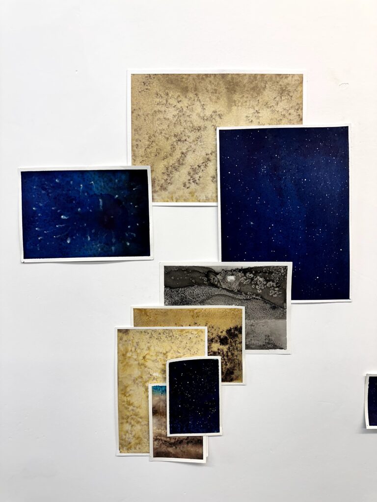 Fakat bu sergide yeni bir şeyleri haber veren ilk yapıtlar, adını sergiyle paylaşan Hüzme pentür serisi. Bu pentürler sanatçının farklı aşamalarda mavi mürekkeple örttüğü; tuz, alkol, karbonat karışımıyla üretilmiş dokulardan müteşekkil. Kağıt üzerine inşa edilen bu pentürler, ayrıca kağıdın üstüne binen renk ve doku katmanlarını taşıma kapasitesini de zorlayarak belirli bir açıdan kağıdı salt taşıyıcı bir yüzey olmaktan çıkarmış ve yapıtın imgesel bir parçası kılmış. Peki nedir burada sanatçı açısından yeni olan?