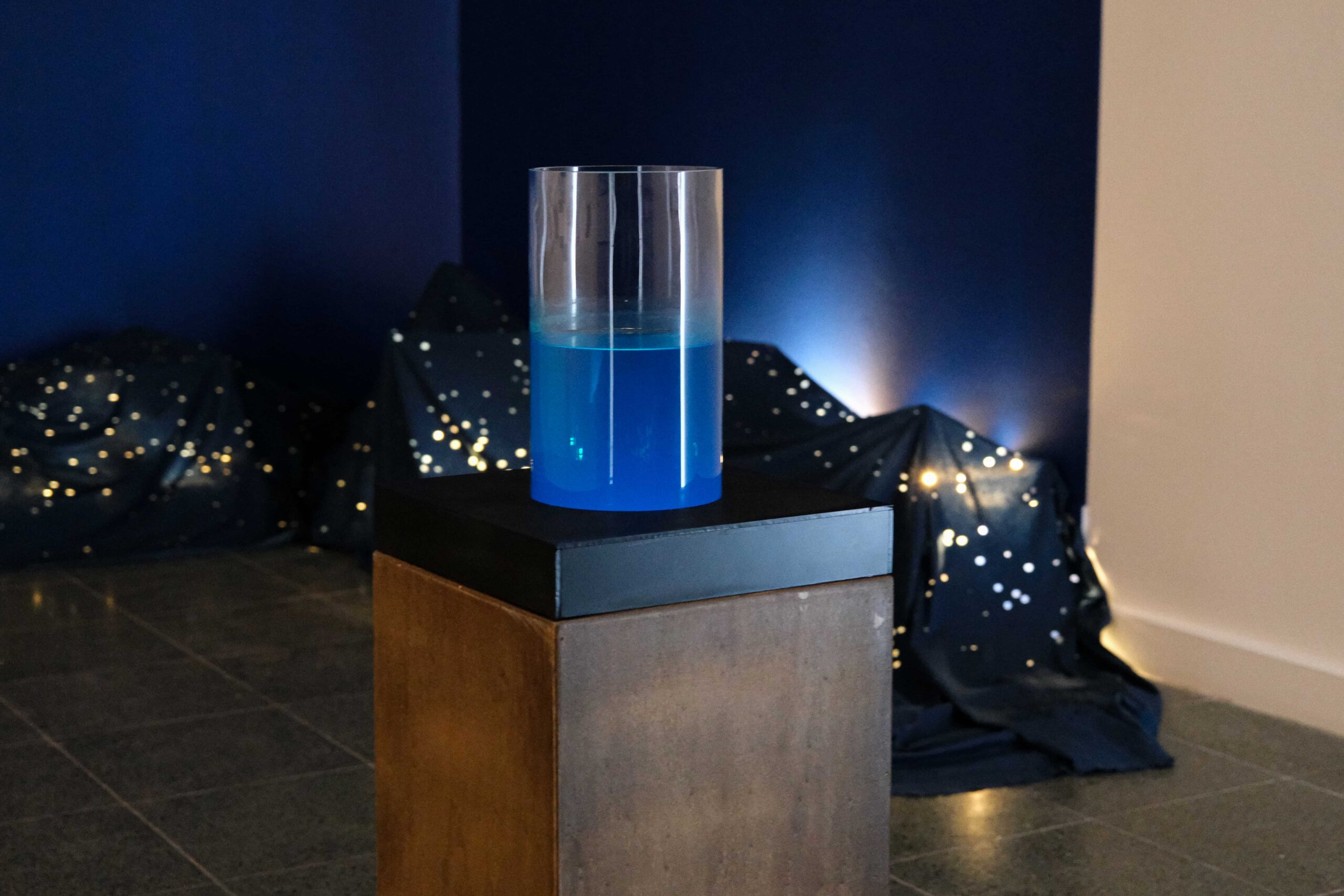 Mavi Kuyu, bir kaide üzerinde içi mavi mürekkepli suyla dolu bir cam hazne ile onun altına yerleştirilmiş bir ekrandan yayılan fakat hangi imgelerden kurgulandığı anlaşılmayan bir videodan oluşuyor. Haznedeki mavi mürekkepli su, videoyu büyük oranda örterek içeriğini belirsizleştiriyor: Belki toplumsal olaylardan kesitler, belki bir aşk filminden sahneler, belki uç uca eklenmiş internet “meme”leri… Mühim olan nokta, seyircinin bu yapıtla ancak belirsiz bir örtme-sızma ilişkileri bağlamında karşılaşabilmesi.
