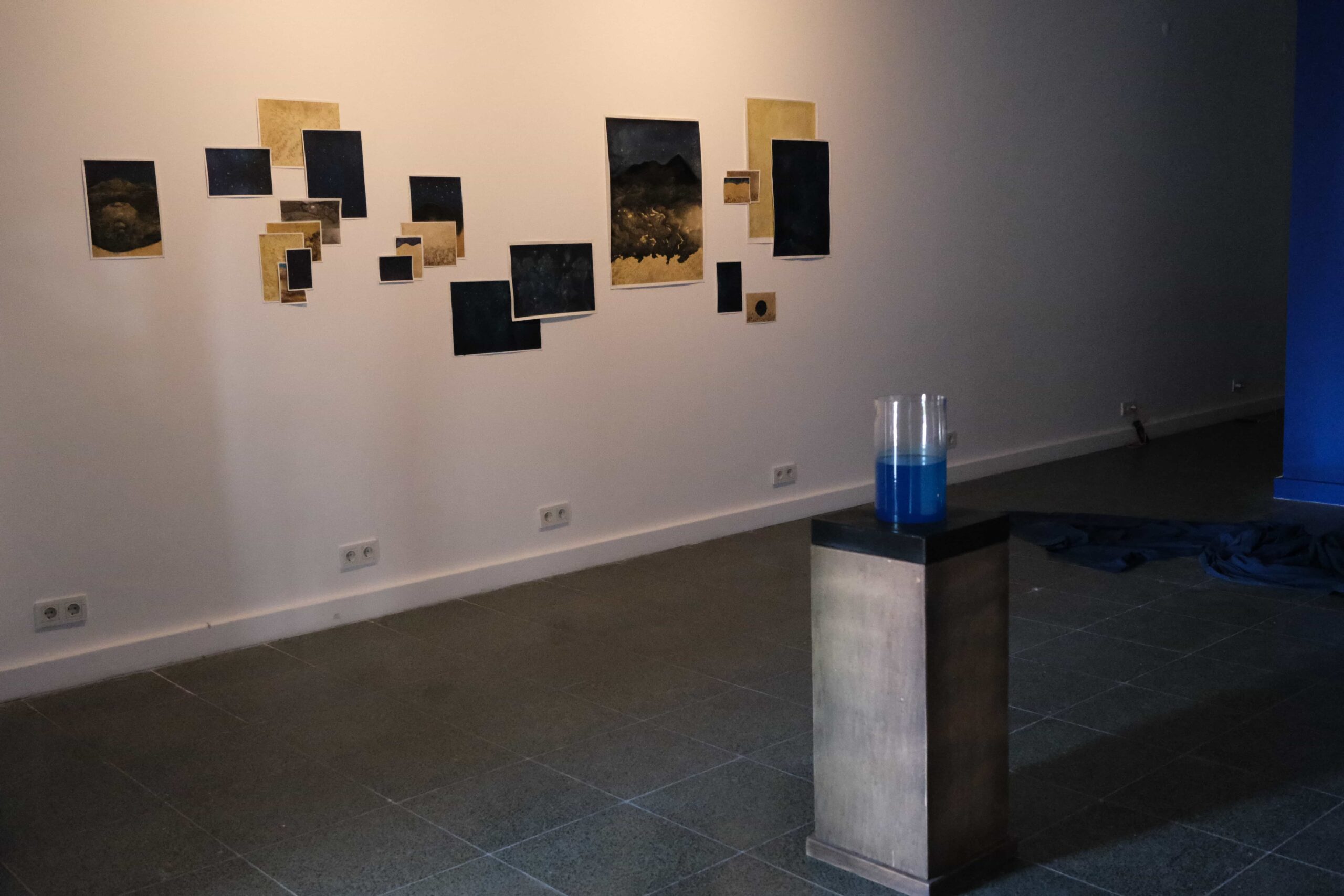 Fakat bu sergide yeni bir şeyleri haber veren ilk yapıtlar, adını sergiyle paylaşan Hüzme pentür serisi. Bu pentürler sanatçının farklı aşamalarda mavi mürekkeple örttüğü; tuz, alkol, karbonat karışımıyla üretilmiş dokulardan müteşekkil. Kağıt üzerine inşa edilen bu pentürler, ayrıca kağıdın üstüne binen renk ve doku katmanlarını taşıma kapasitesini de zorlayarak belirli bir açıdan kağıdı salt taşıyıcı bir yüzey olmaktan çıkarmış ve yapıtın imgesel bir parçası kılmış. Peki nedir burada sanatçı açısından yeni olan?