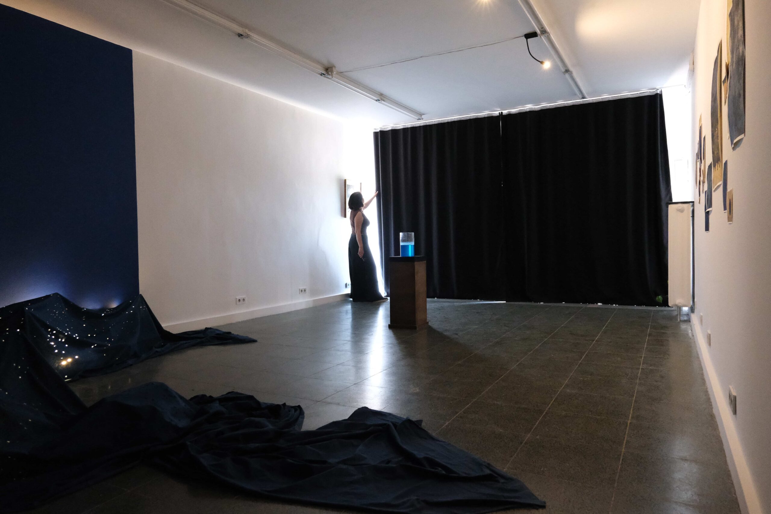Sergiyi oluşturan yapıtların -belki çorak topraklar üzerinde dolunay ve yıldızlarla ışıl ışıl bir gece göğünü betimleyen İsimsiz pentürü hariç- tamamı farklı örtme biçimlerini ele alıyor. Örneğin Kayıp Işığın Gölgesi isimli mekâna özgü yerleştirme, buluntu nesnelerin üzerini örten mavi bir kumaştan oluşuyor ve galerinin kasten perdeyle karartılmış iç mekânında maviye boyanmış iki duvarın alt kısmını işgal ediyor. Bu yapıtta sanatçının daha önce inşa ettiği -“Yıkıntılar Arasında” (2024, Barın Han) sergisinde görme şansına eriştiğim (ismiyle müsemma) Kıyıya İtilmiş Işıkların Mutluluğu isimli video gibi- yapıtlarındaki kenara itilmişlikle kurulan bağı görmemek mümkün değil. Yine bir yığın nesne, bu defa değersizlik tesiri üretecek bir düzensizlikle kenara atılıvermiş.