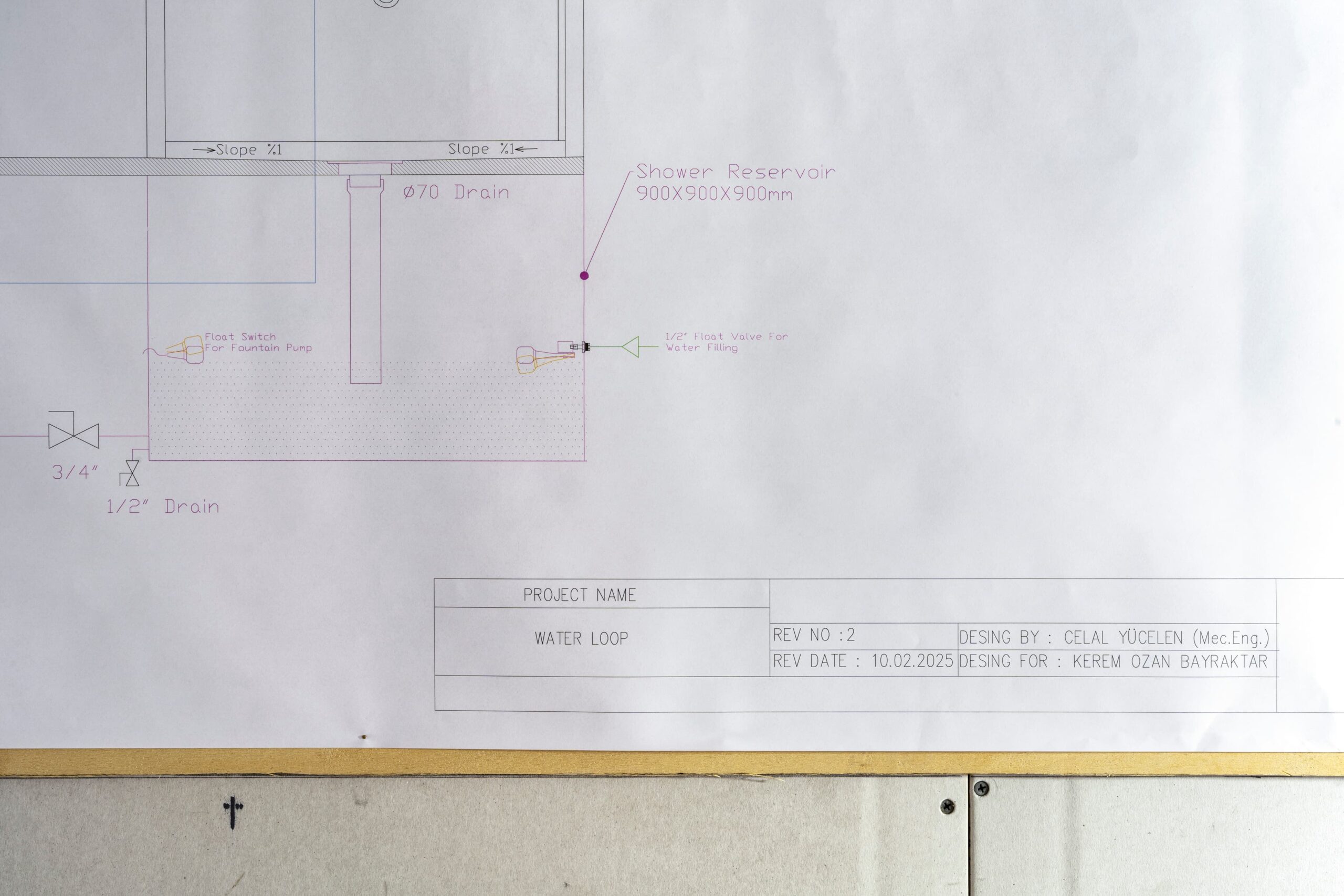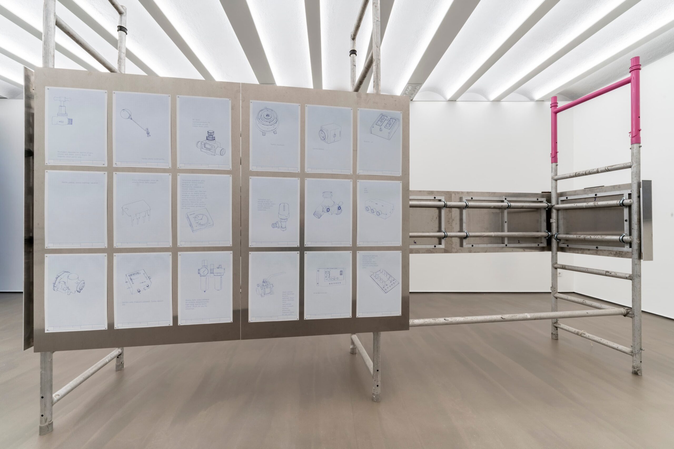 Malzeme: Öte yandan malzeme diye bir şey var. Serginin bir kısmı da bununla alakalı. Malzeme ile onu kullanan insan arasındaki yakın ilişki (empati?, aşk?) bana çoğu kere Bayraktar’ın işlerinin astarı gibi gelir. 2001, Bir Uzay Macerası’nda kendisini yok etmek isteyen astronota uzay aracının kapısını açmayı reddeden küskün aşık bilgisayar Hal’inki kadar intikamcı, Uğultulu Tepeler romanındaki Heathcliff’le Kathy’ninki kadar tutkulu olmasa da, malzeme ile onu kullanan arasında bir aşk birikir. Sonra bir gün… Izgara desenli kağıtlara nakşedilmiş (diyeceğim) malzeme ya da düzenek çizimlerinden birinde dendiği gibi: Sistem “Yavaş yavaş sızdırıyordu”r. Arıza, malzemenin artık-o-eski-kusursuz-şey-olmaması biriken şeyin bitişine denktir. Tamir “Kimsenin hatırlamadığı bir incelik gerektiriyordu”r. Ya da “… ne duraklıyor ne de hızlanıyordu”r, “sadece tamamen çökmeyi reddeden diğer her şey gibi monoton ve kayıtsız vızıldıyordu”r.