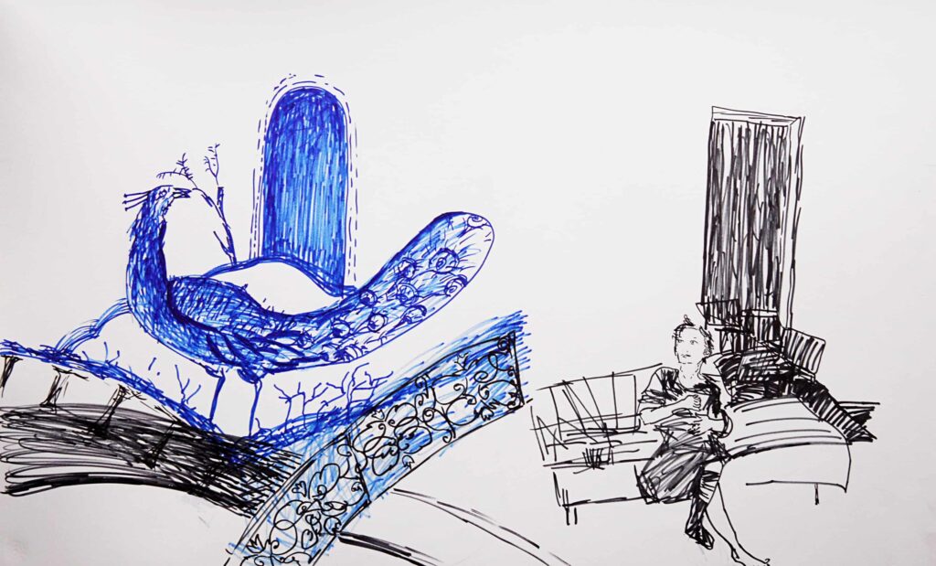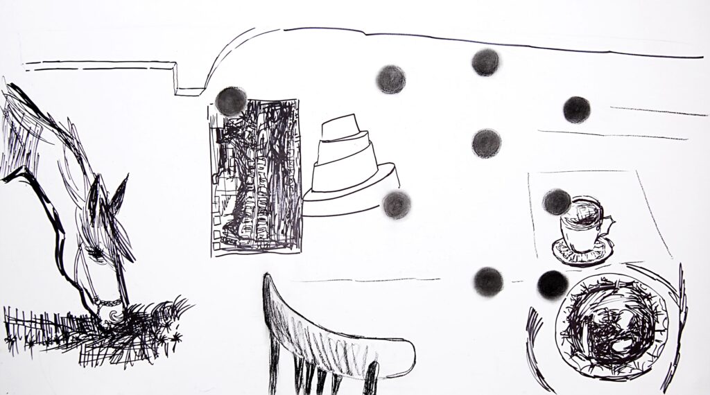 “Bu sergi, okuduğum bir hikâye (Trianon Pastanesi – Leyla Erbil) ve hikâyenin geçtiği mekânı galeri ortamına taşıma fikri ile oluştu.