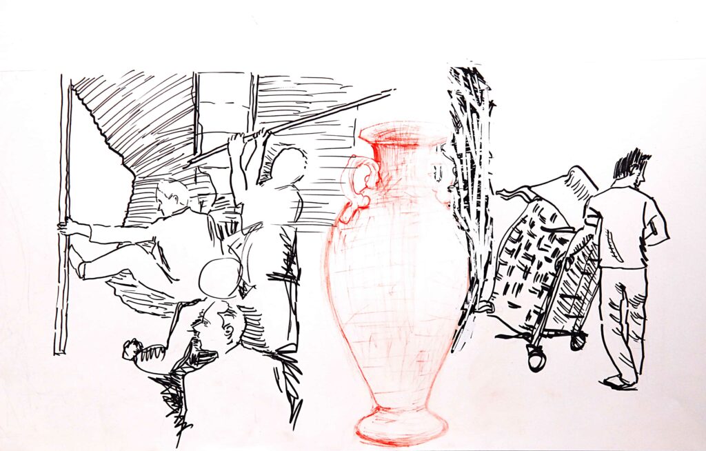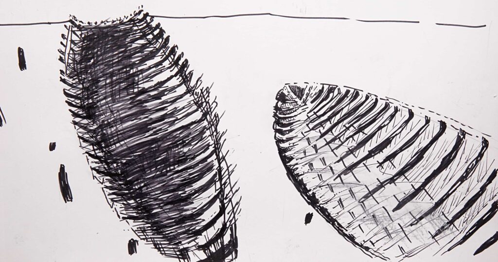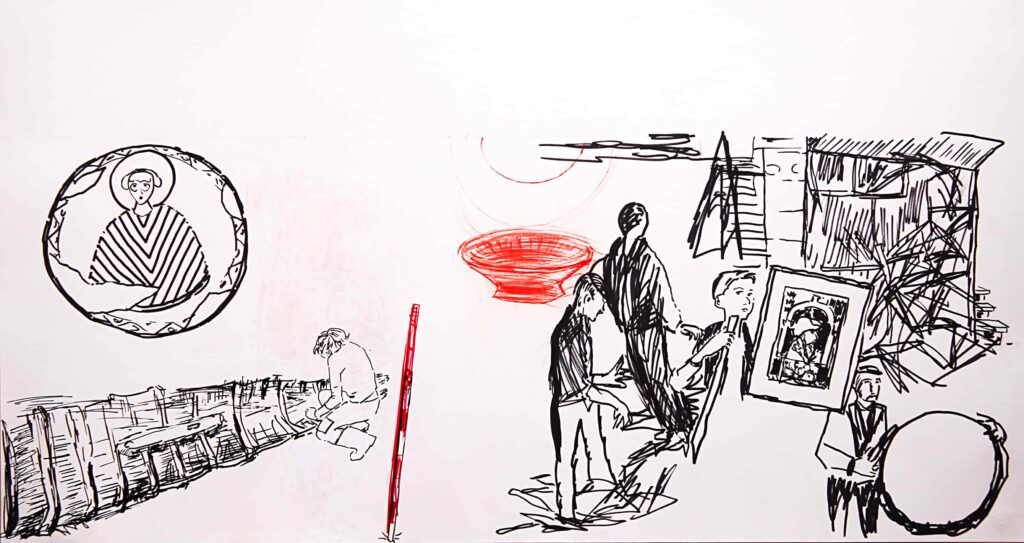 Bu sergi, mekânda ve zamanda düz ve derinlemesine yapılan bir tür kazı çalışması olarak düşünülebilir. Sergi desen, fotoğraf ve metin parçalarından oluşuyor. Fotoğraflarda fiziki çevre, yani mekânın bugünkü hali, tarihi duvar kalıntıları, mimari elemanlar; desenlerde geçmişte yaşanmış şiddet, yıkımlar, arkeolojik kazı buluntuları yer alıyor. Yer İstanbul, bağlayıcı unsur su ve su elemanları; tekne enkazları, kaplar…
