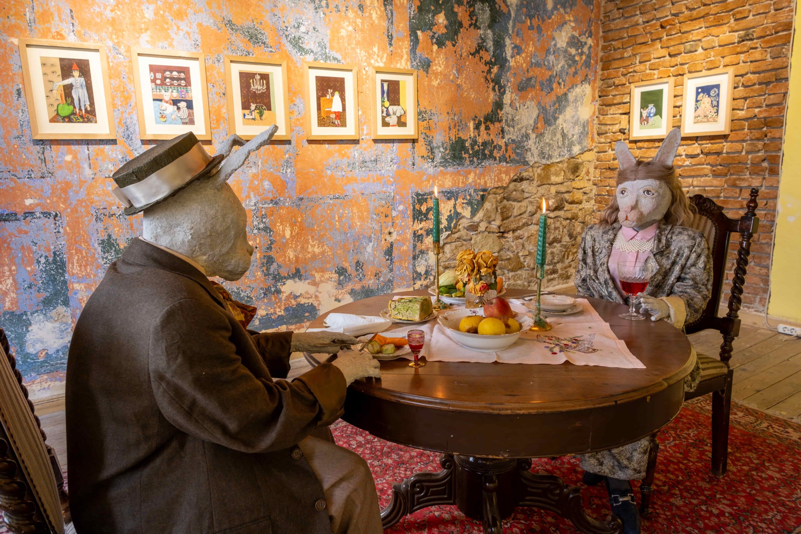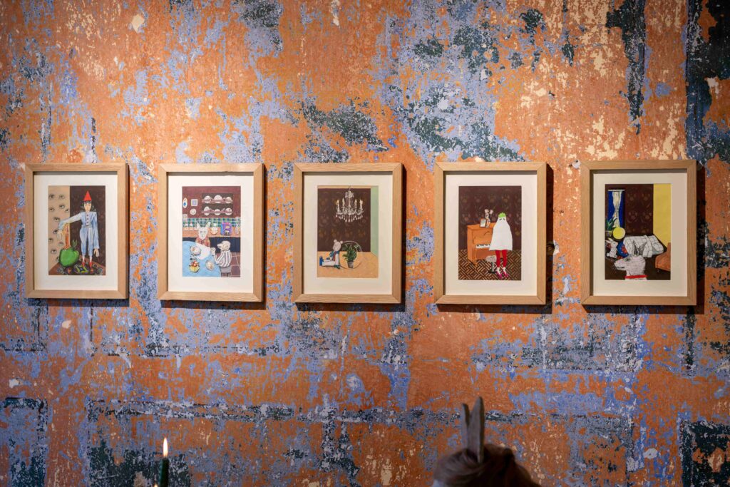 Bordo Bina’nın odalarından birinde sanatçının mekânla kurduğu bağları ve hafıza katmanlarını yansıtan sergi, karışık teknik desenler ve kâğıt hamurundan figürlerin yer aldığı bir akşam yemeği yerleştirmesinden oluşuyor.